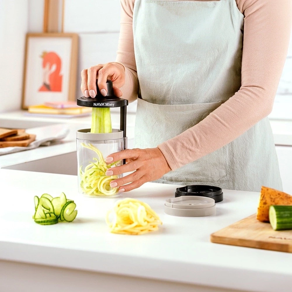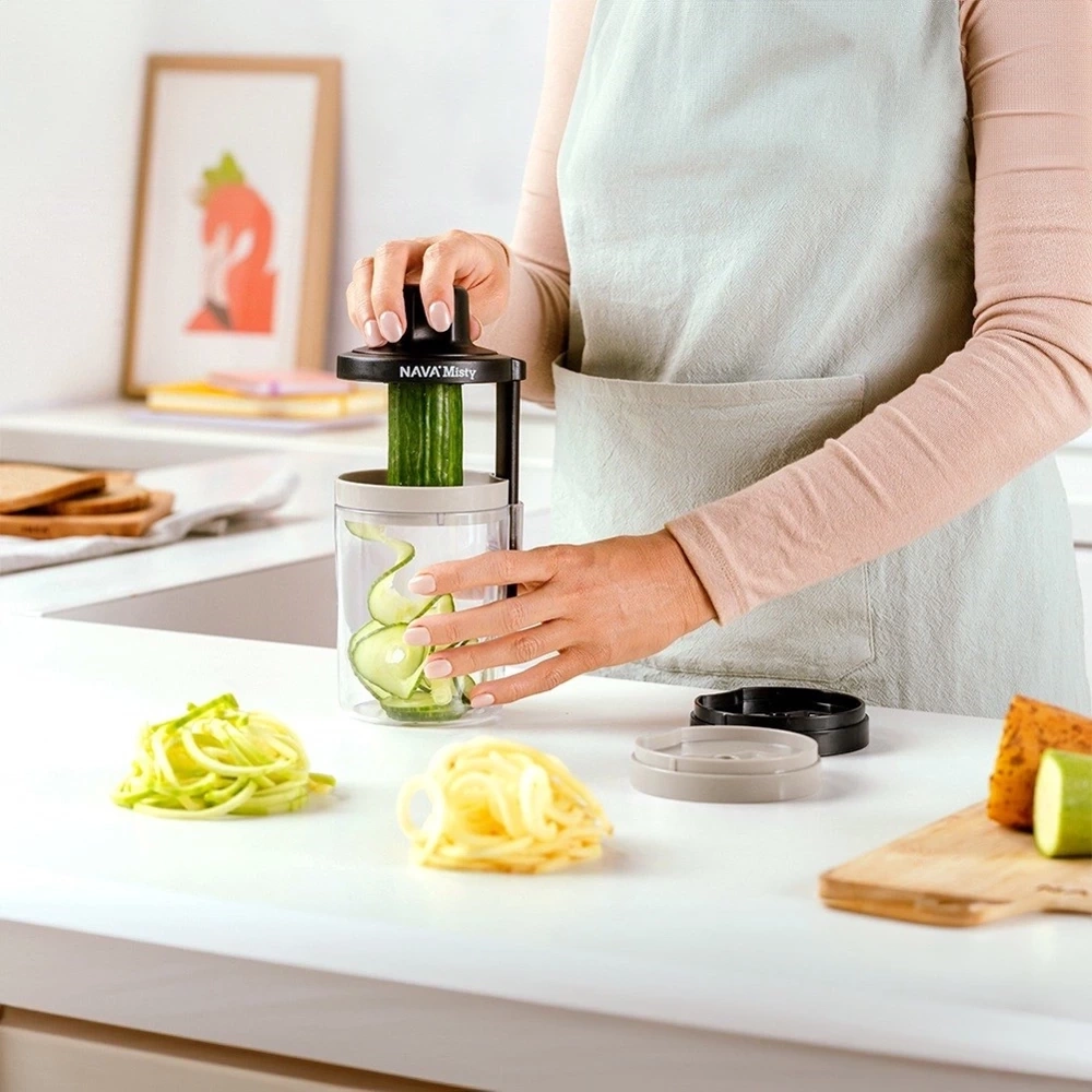- Wygodne użytkowanie - Szatkownicę wyczyścimy w wygodny sposób, gdyż nadaje się do mycia w zmywarce do naczyń. Łatwa w użytkowaniu wystarczy umieścić warzywo na specjalnym kolcu, przymocować do pojemnika i obracać uchwyt na górze, aby uzyskać wybrany kształt cięcia.