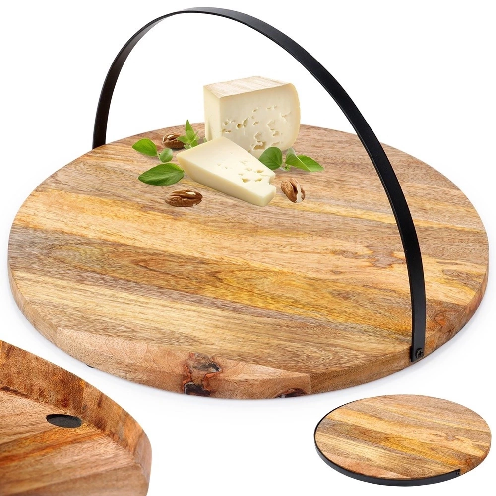 - Deska do serwowania z wygodnym uchwytem - Deska do serwowania dań, przekąsek i potraw z praktycznym uchwytem. Uchwyt ułatwi przenoszenie, a dodatkowo posiada sznurek, który pozwoli swobodnie odwiesić tacę. Może służyć również jako podstawka pod inne naczynia. Taca ma okrągły kształt i wymiary całkowite 38,5 x 2 cm, wysokość z postawionym uchwytem wynosi 21 cm.