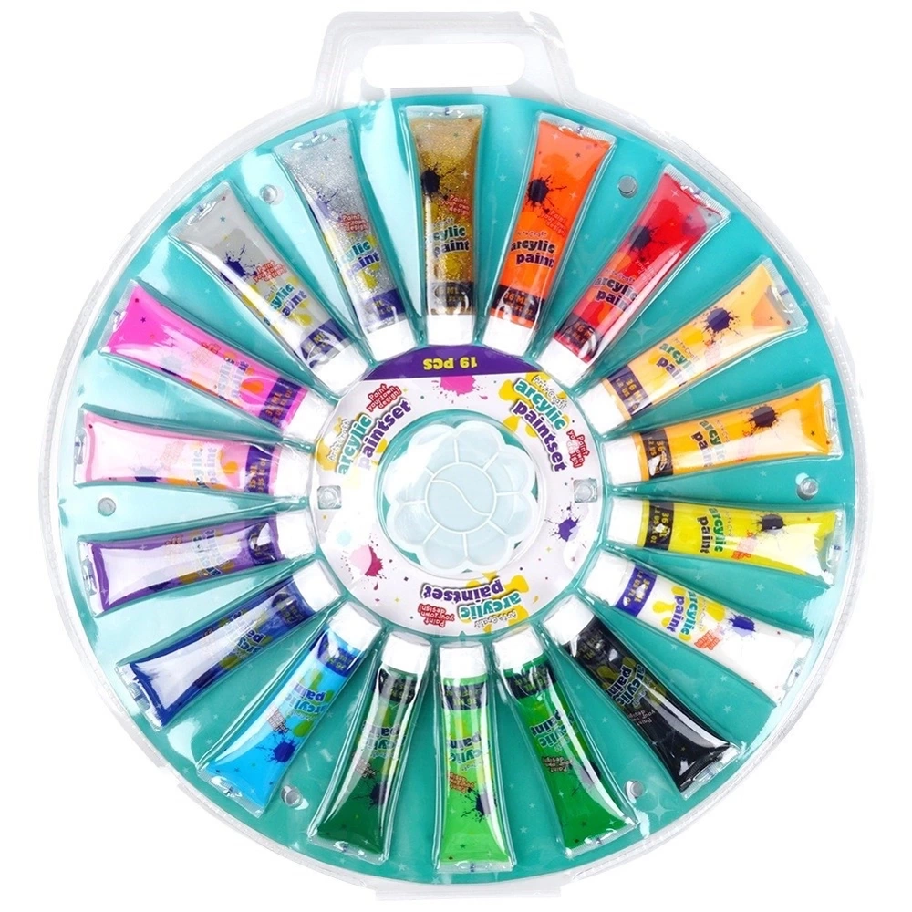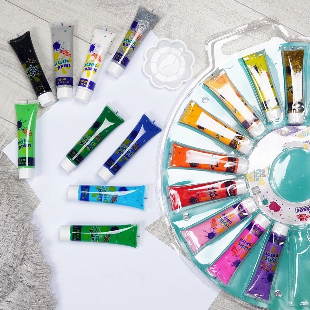 - Zestaw kolorowych farb akrylowych do malowania w tubkach. W zestawie 18 kolory oraz paletka wykonana z tworzywa. Idealne dla profesjonalistów oraz amatorów.