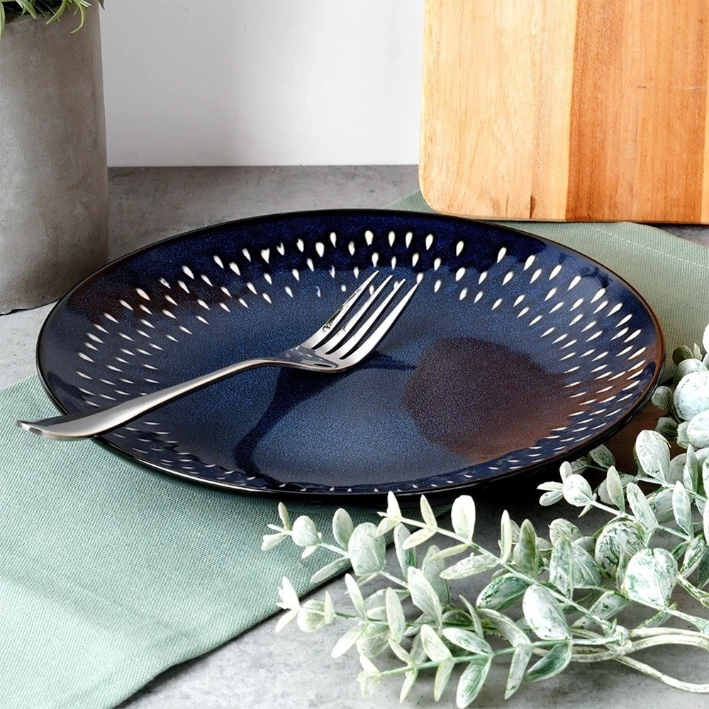 - Talerz deserowy o średnicy 22 cm. Wykonany z ceramiki gresowej w granatowym kolorze. Sprawdzi się do serwowania ciast, deserów i przekąsek.