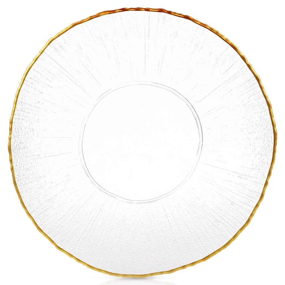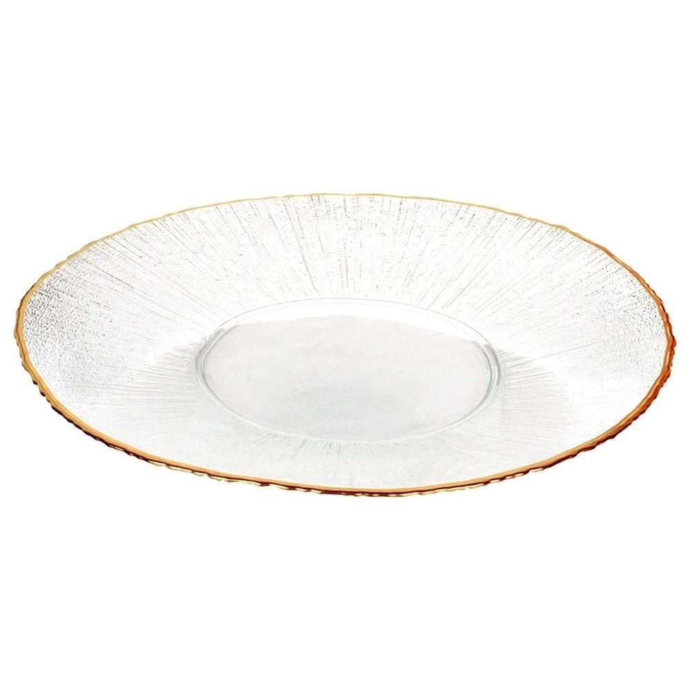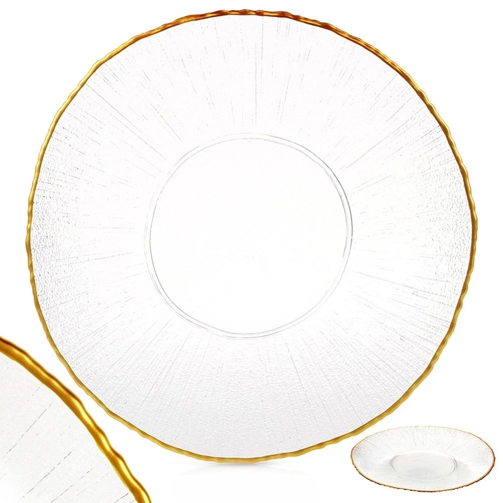 - Wykonany ze szkła - Wykonany z najwyższej jakości przezroczystego szkła, które swoją strukturą imituje kryształ. Rant talerza jest w kolorze złotym. Odpowiednio użytkowany posłuży długie lata.
