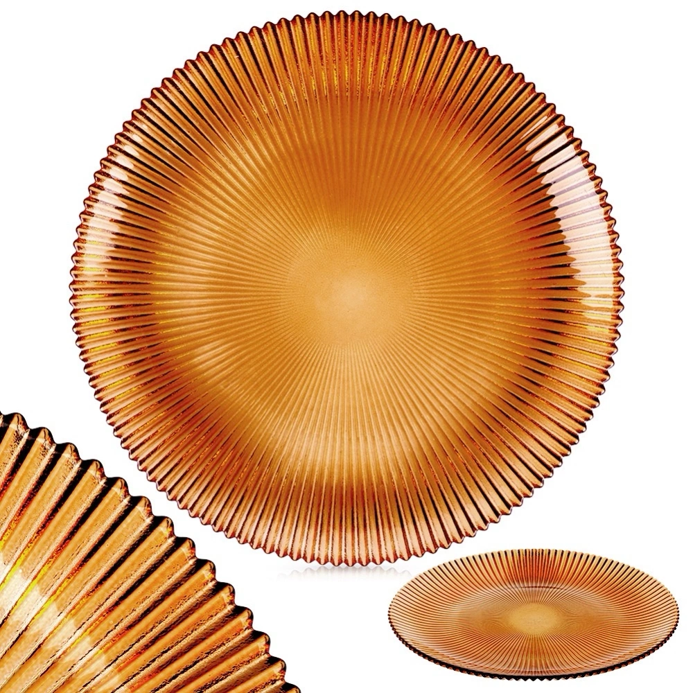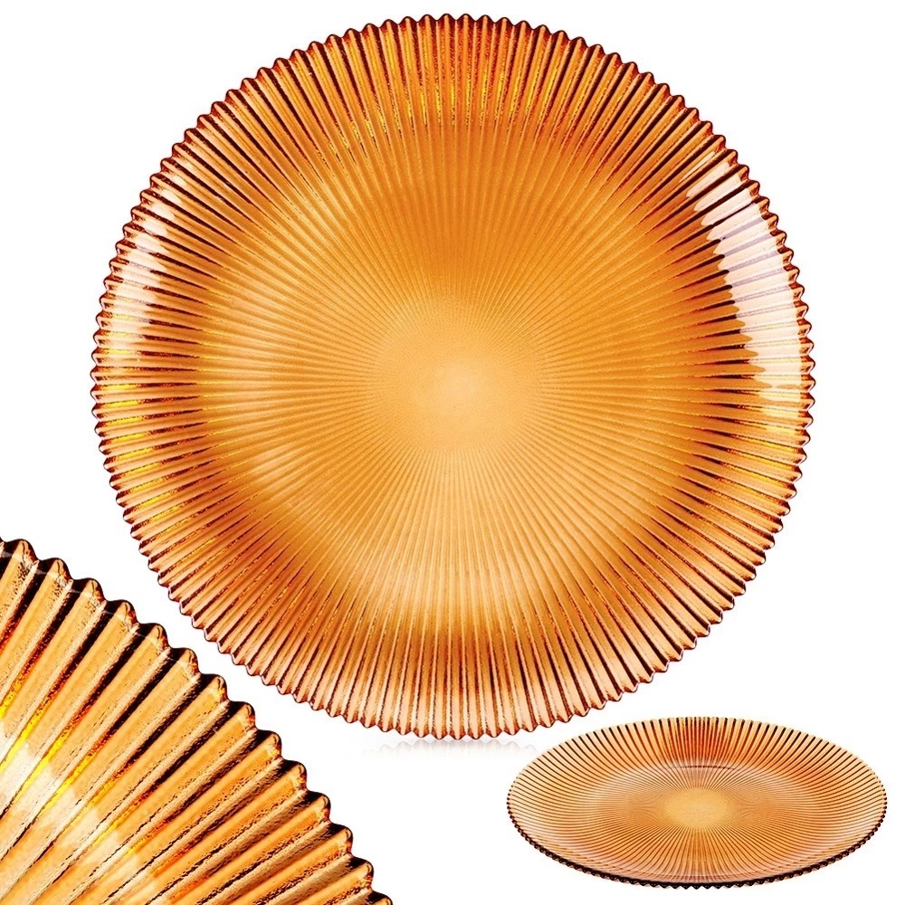 - Wykonany ze szkła - Wykonany z najwyższej jakości szkła w bursztynowym kolorze. Talerz charakteryzuje się wyjątkowym wzorem promieni, które rozchodzą się od środka, tworząc efektowny, stylowy wygląd. Odpowiednio użytkowany posłuży długie lata.