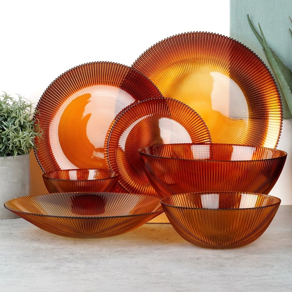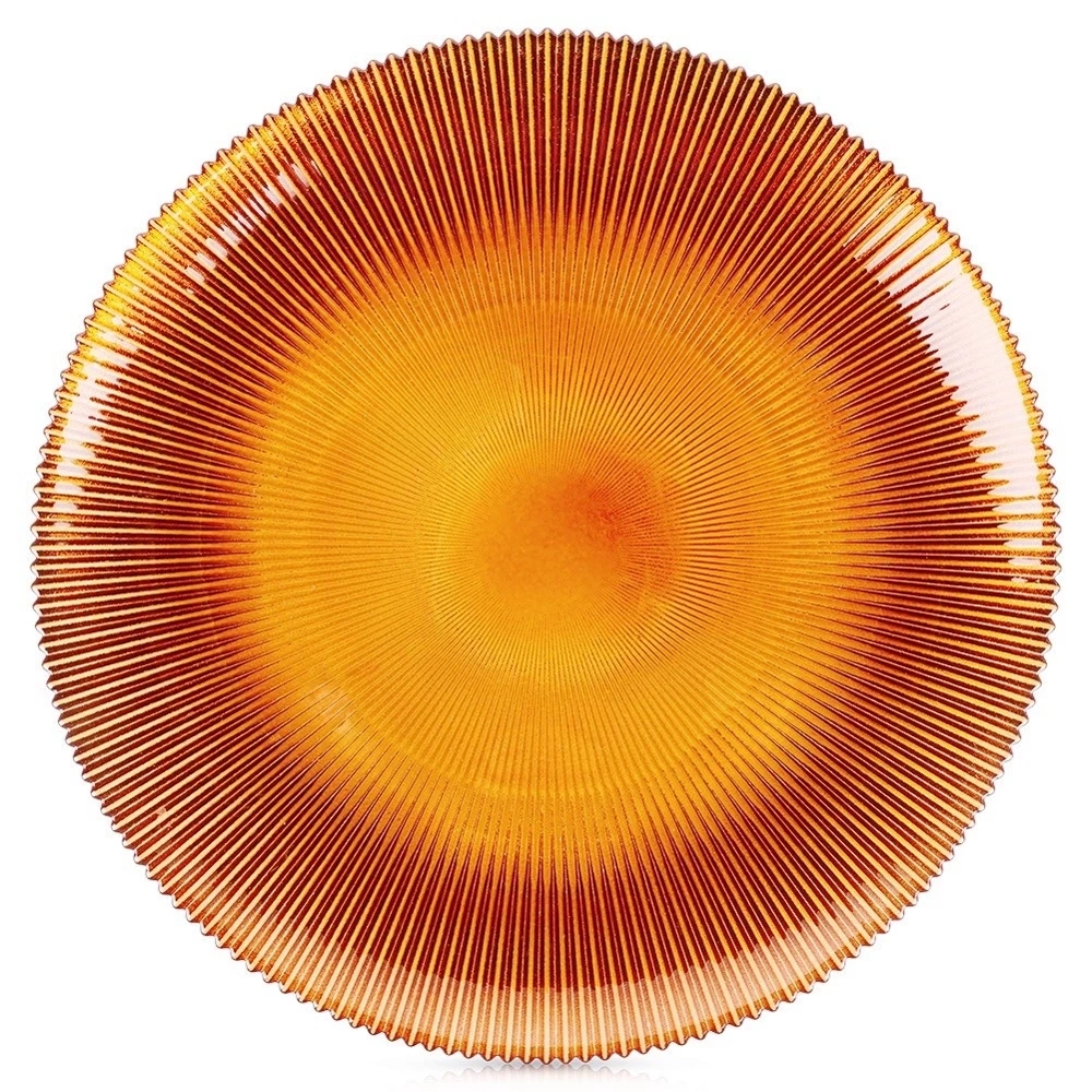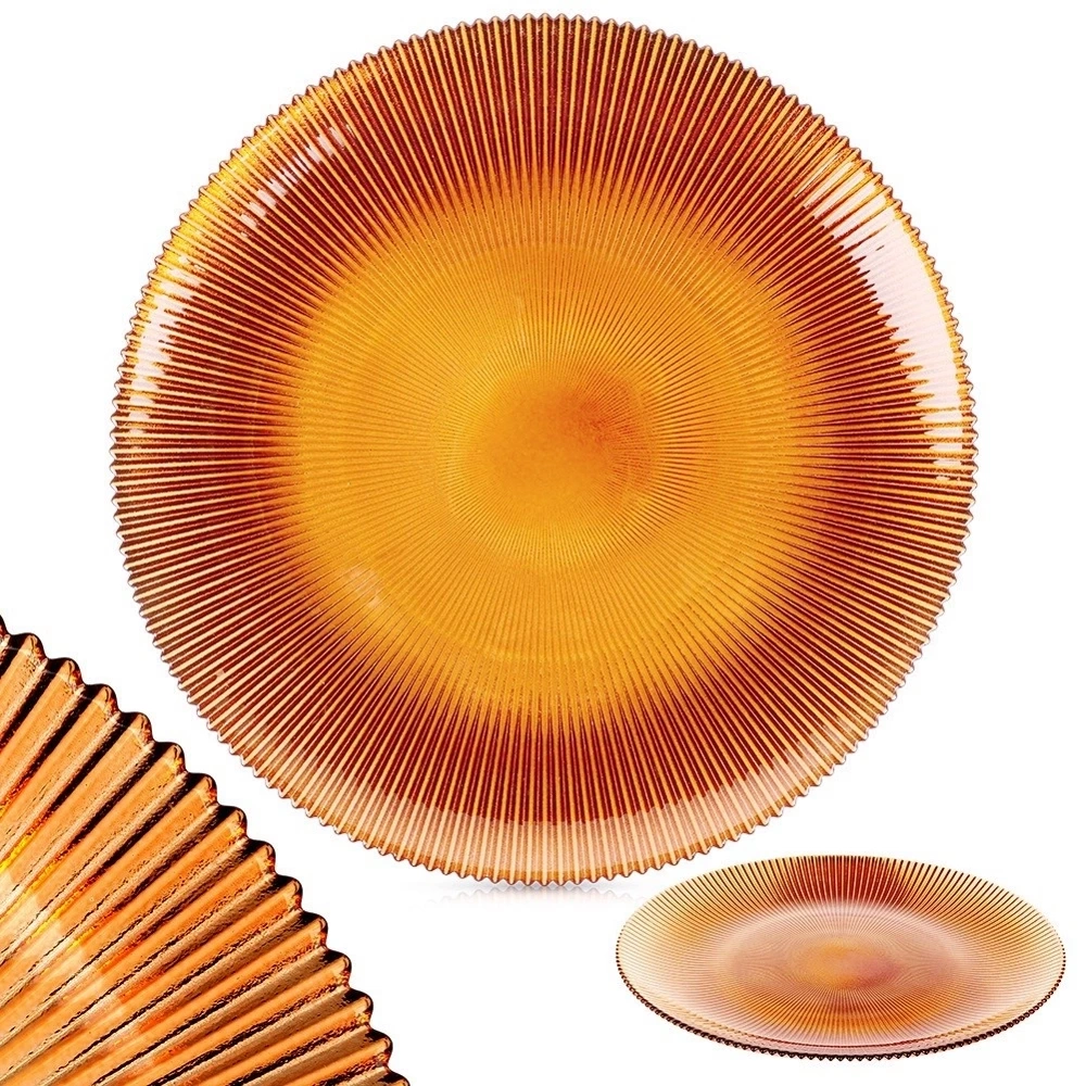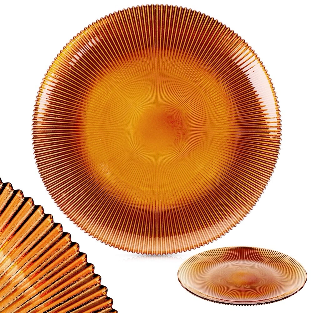 - Wykonany ze szkła - Wykonany z najwyższej jakości szkła w bursztynowym kolorze. Talerz charakteryzuje się wyjątkowym wzorem promieni, które rozchodzą się od środka, tworząc efektowny, stylowy wygląd. Odpowiednio użytkowany posłuży długie lata.
