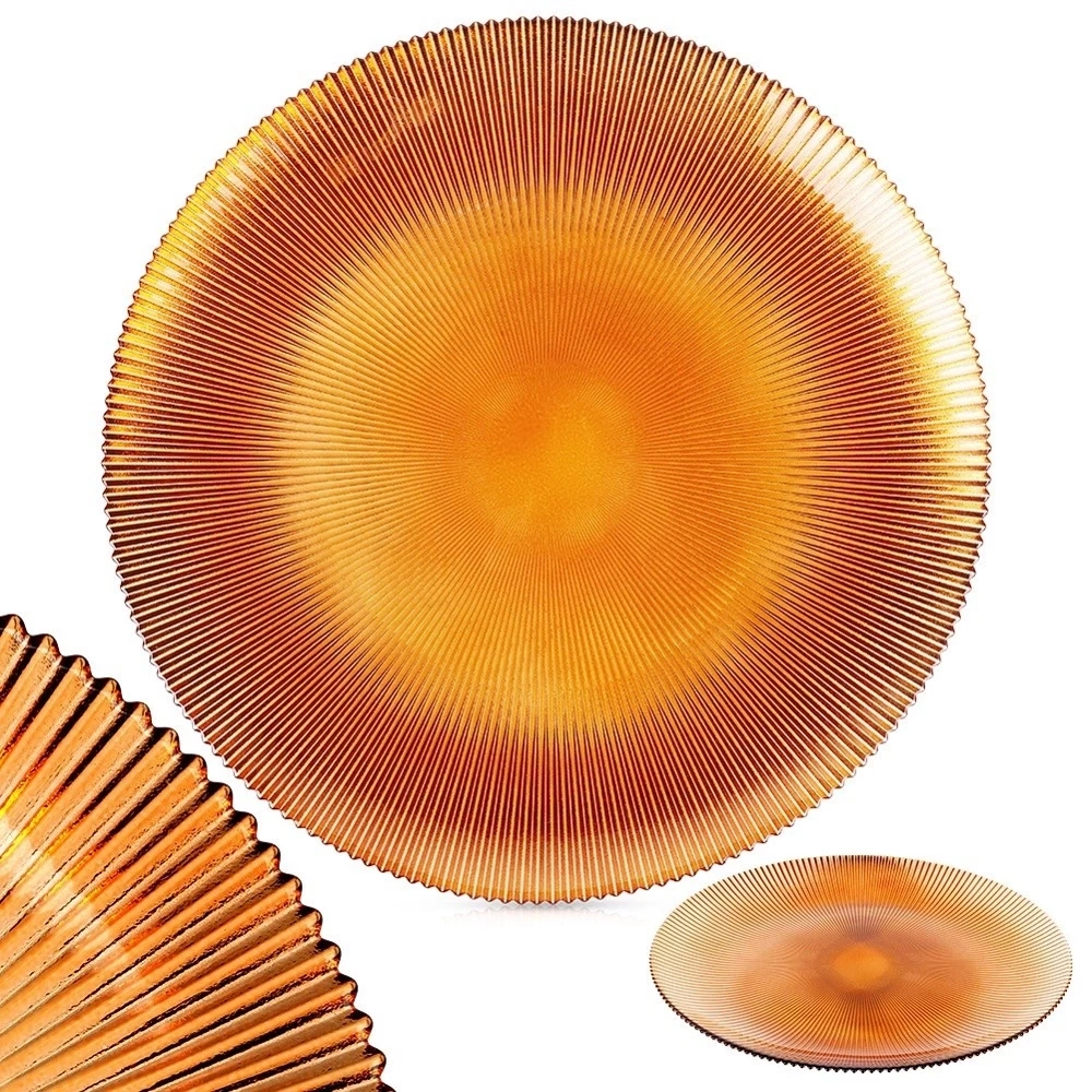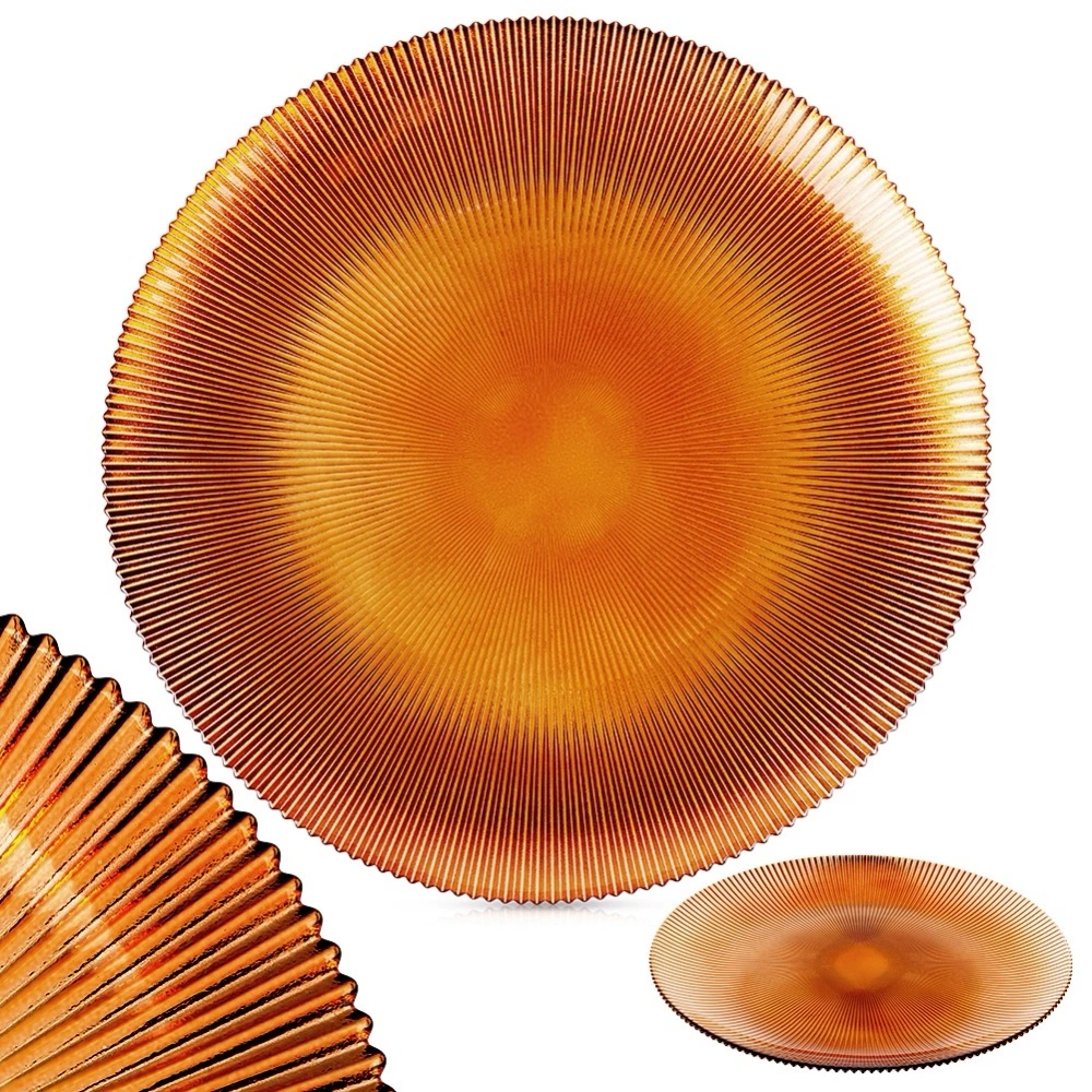 - Wykonany ze szkła - Wykonany z najwyższej jakości szkła w bursztynowym kolorze. Talerz charakteryzuje się wyjątkowym wzorem promieni, które rozchodzą się od środka, tworząc efektowny, stylowy wygląd. Odpowiednio użytkowany posłuży długie lata.