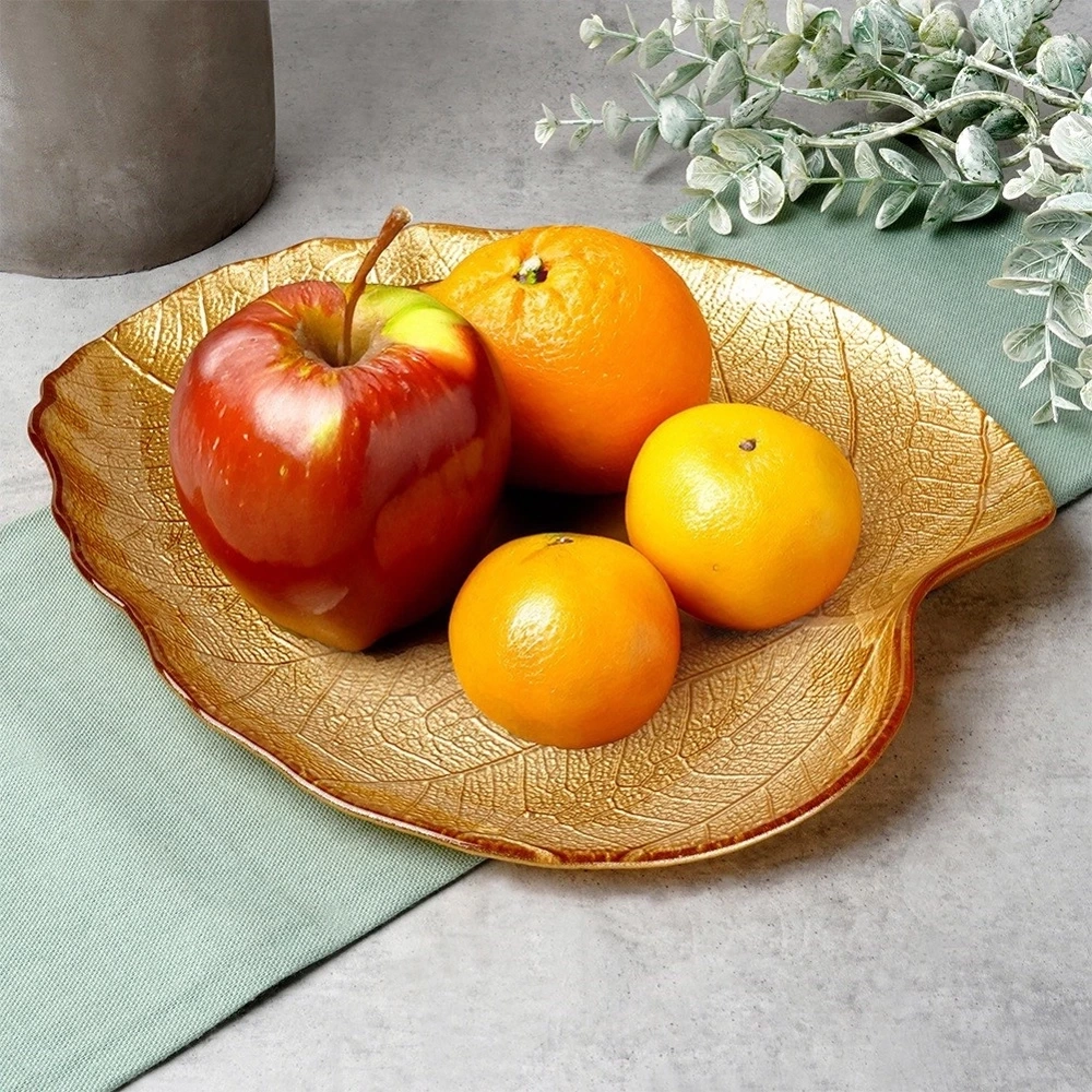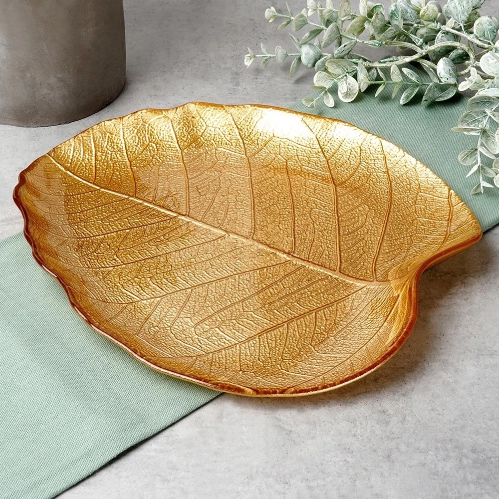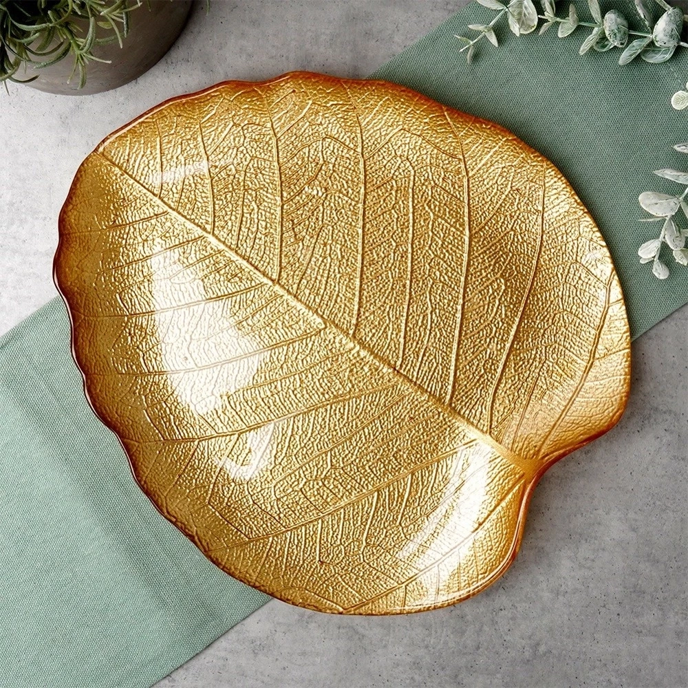 - Talerz do serwowania w kształcie liścia. Wykonany ze szkła w złotym kolorze. Faktura sprawia, że talerz przypomina liść, dodając stołowi unikalnego i eleganckiego wyglądu.