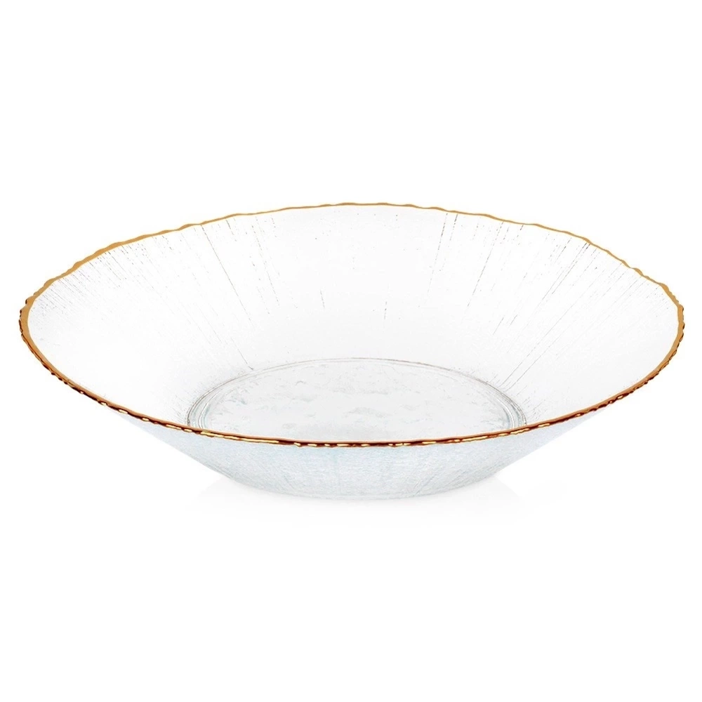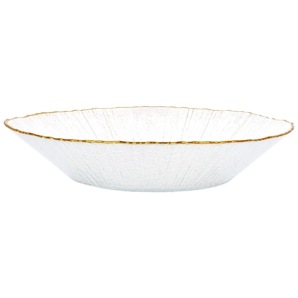 - Miska o pojemności 500 ml i uniwersalnym zastosowaniu. Wykonana ze szkła z eleganckim złotym rantem. Idealna do serwowania sałatek, przekąsek, deserów i potraw.