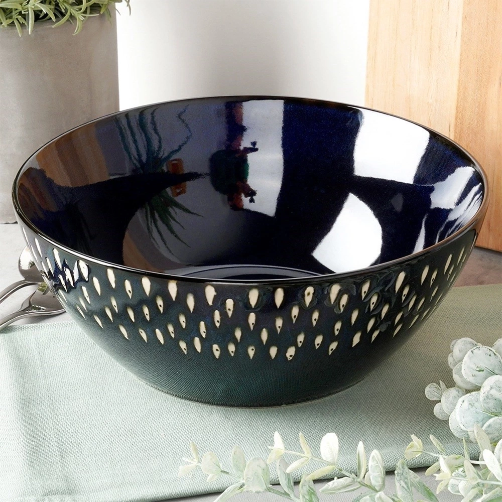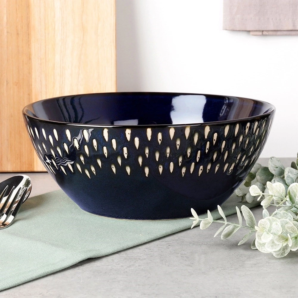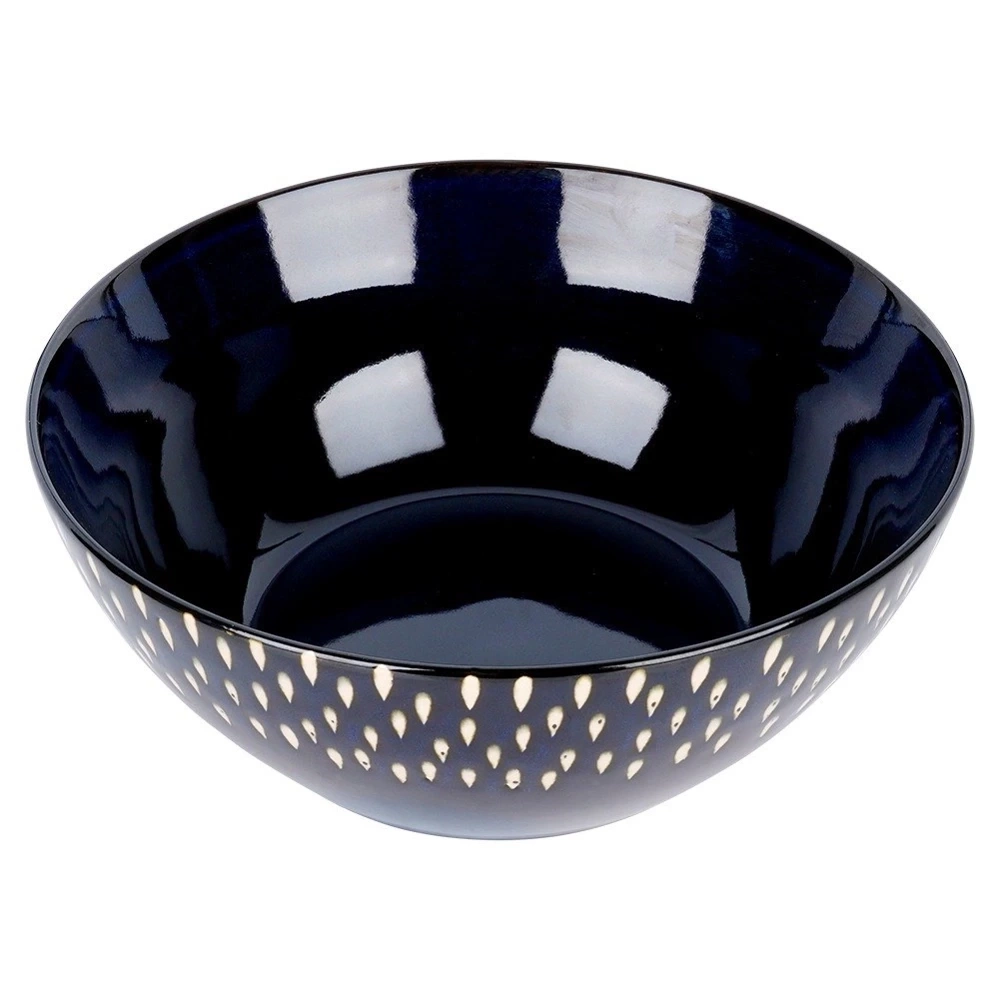 - Miska o pojemności 2 l i uniwersalnym zastosowaniu. Wykonana z ceramiki gresowej w granatowym kolorze. Idealna do serwowania sałatek i przekąsek.