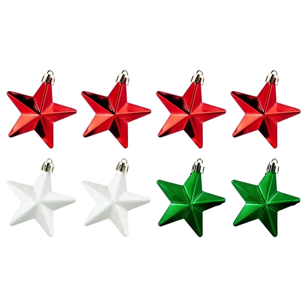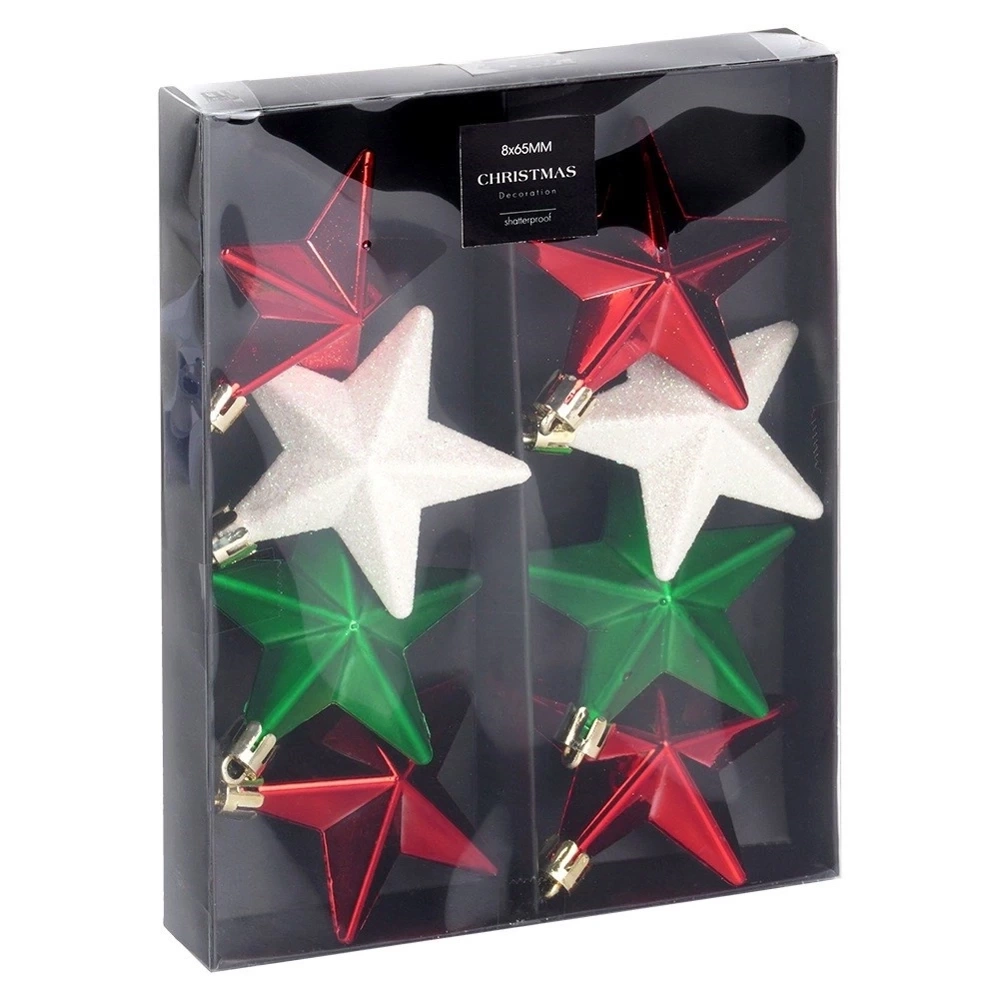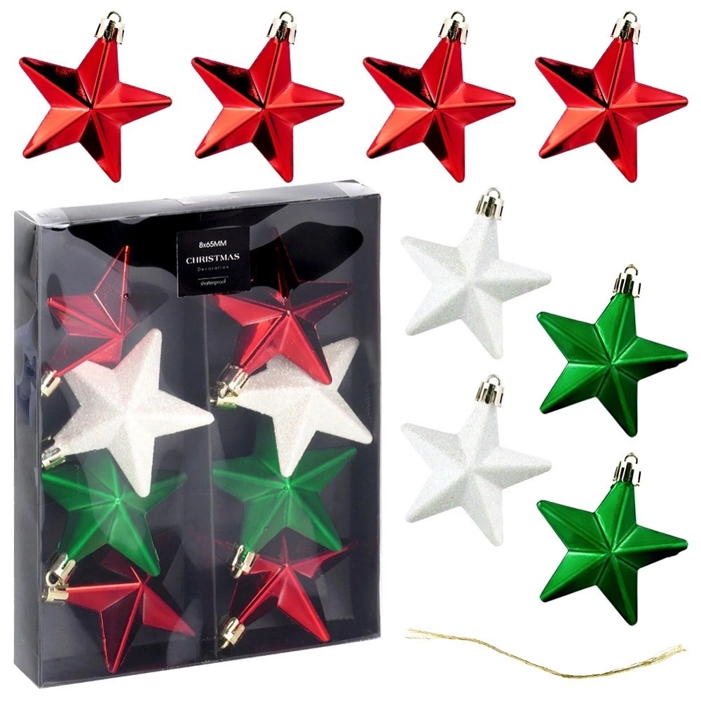 - Zestaw 8 dekoracyjnych bombek na choinkę w kształcie gwiazdek, w kolorach czerwonym, zielonym i brokatowym białym. Bombki są nietłukące.