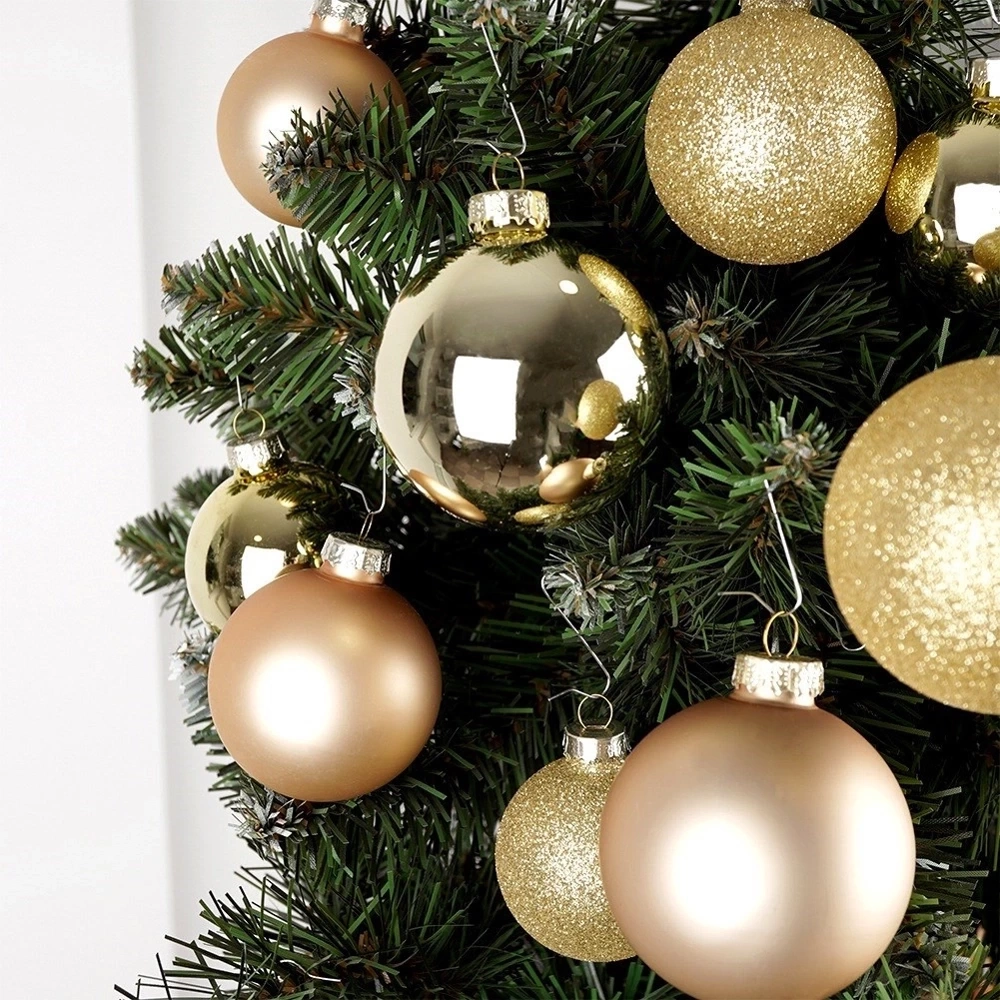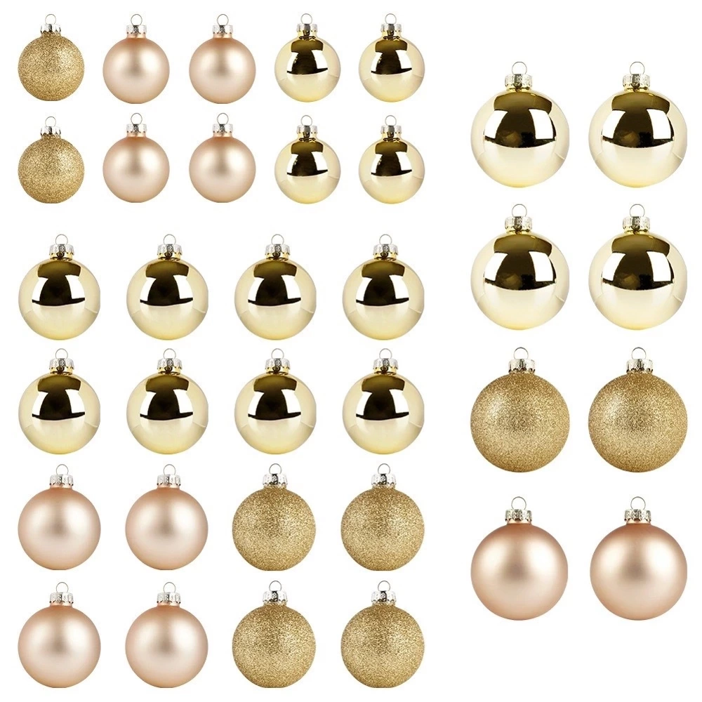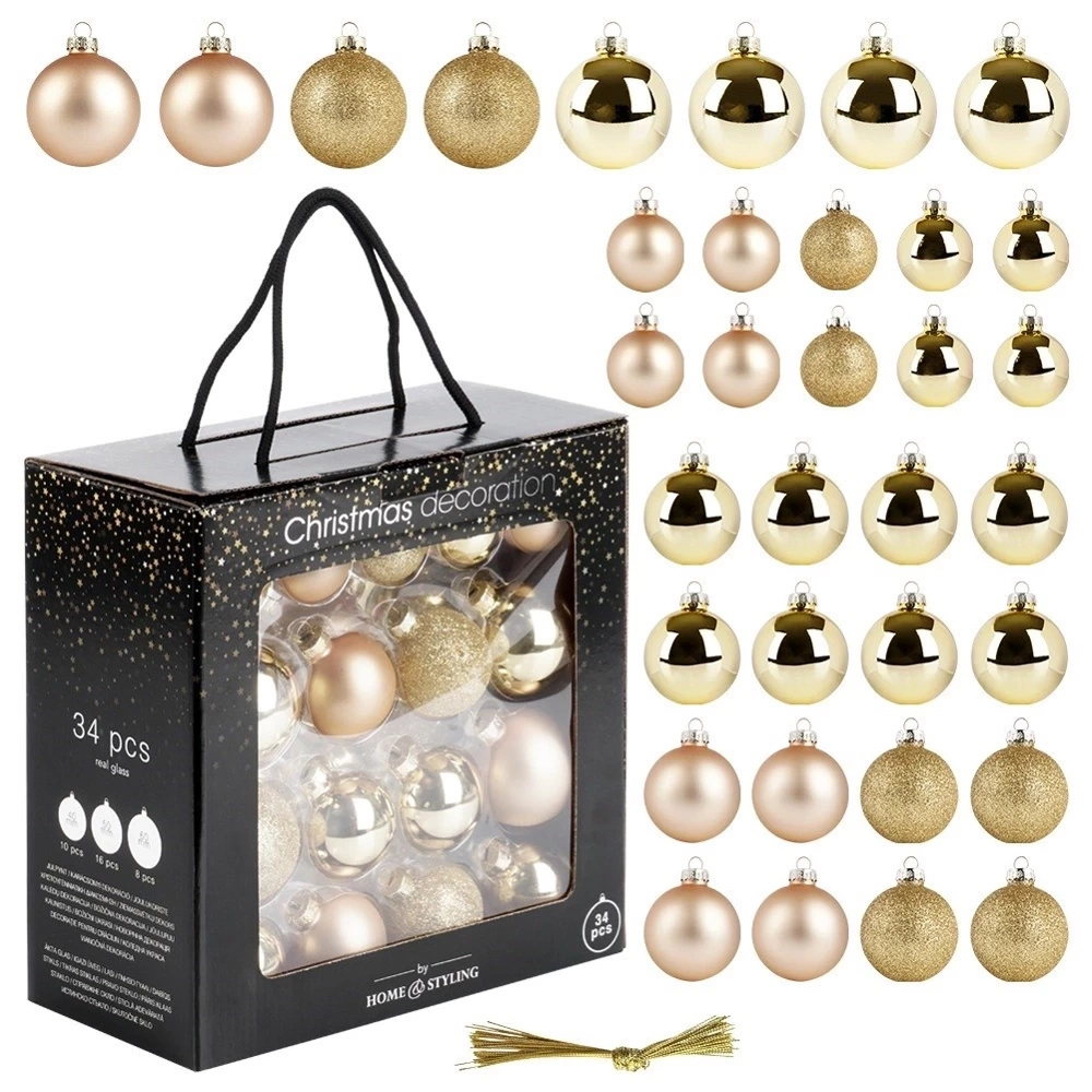 - Zestaw 34 sztuk dekoracyjnych bombek na choinkę. Bombki wykonane są ze szkła w kolorze złotym. W zestawie bombki matowe oraz błyszczące.