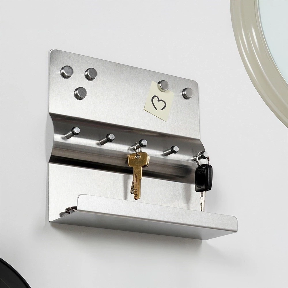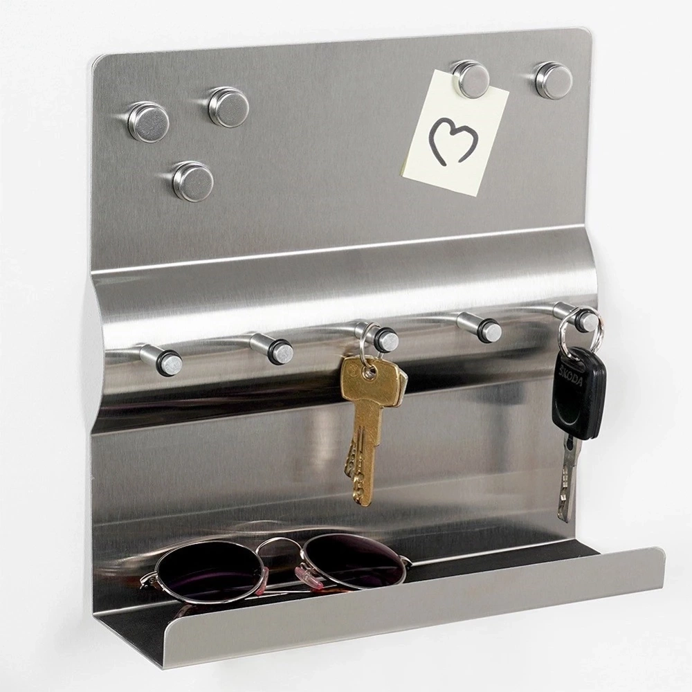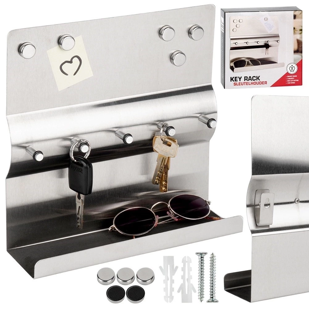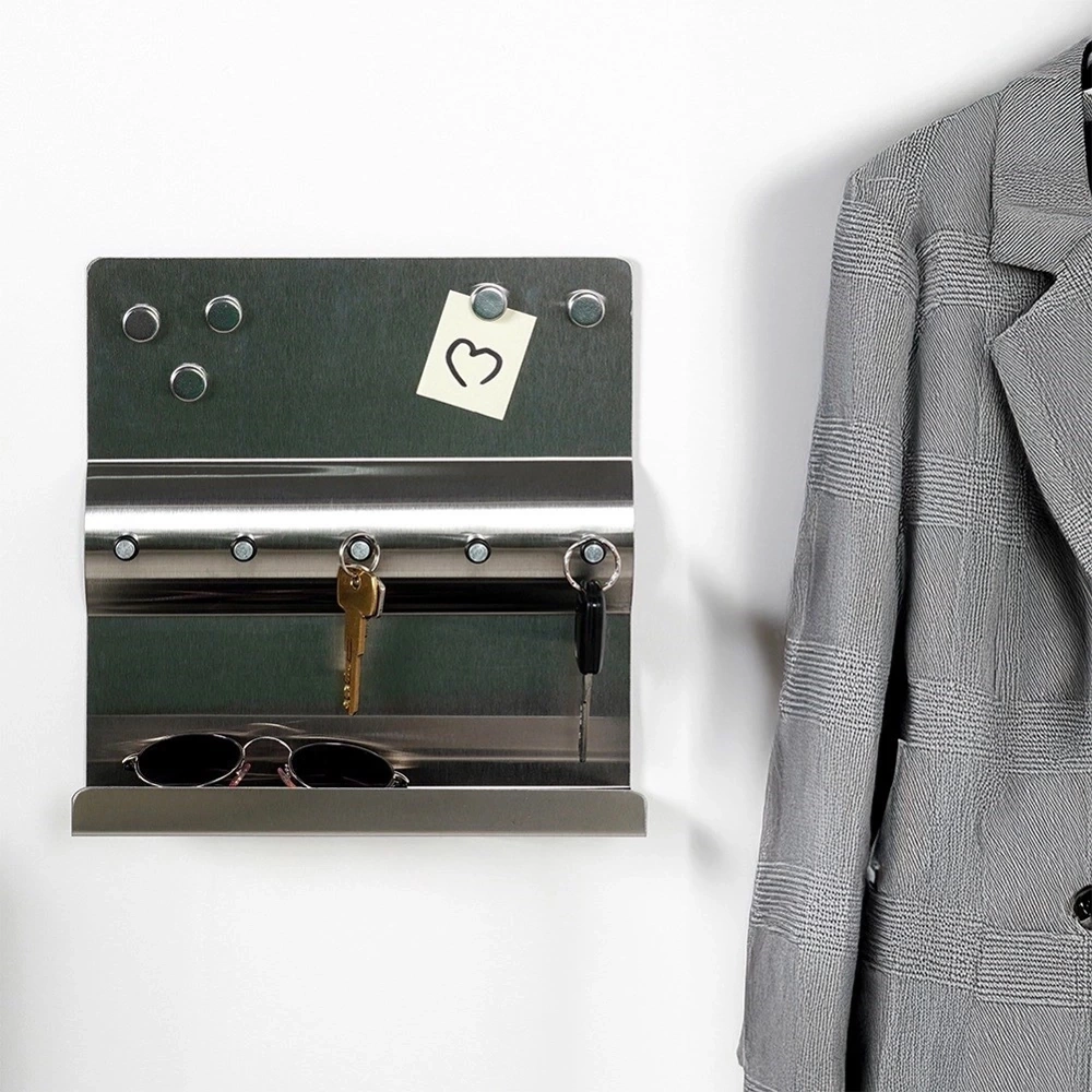 - Funkcjonalny i stylowy wieszak, który pomoże uporządkować klucze i drobne przedmioty. Wykonany ze stali nierdzewnej. Posiada praktyczną półkę i pięć magnesów w zestawie.