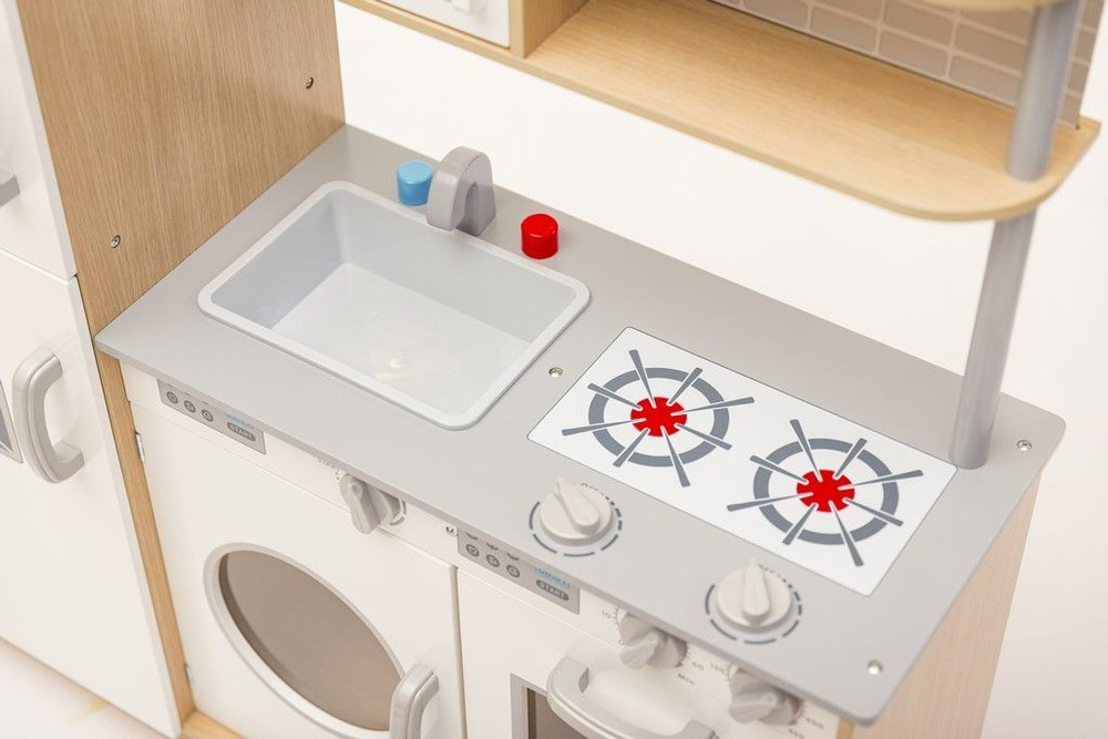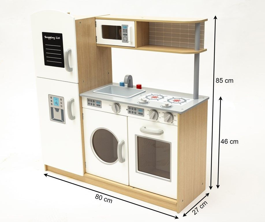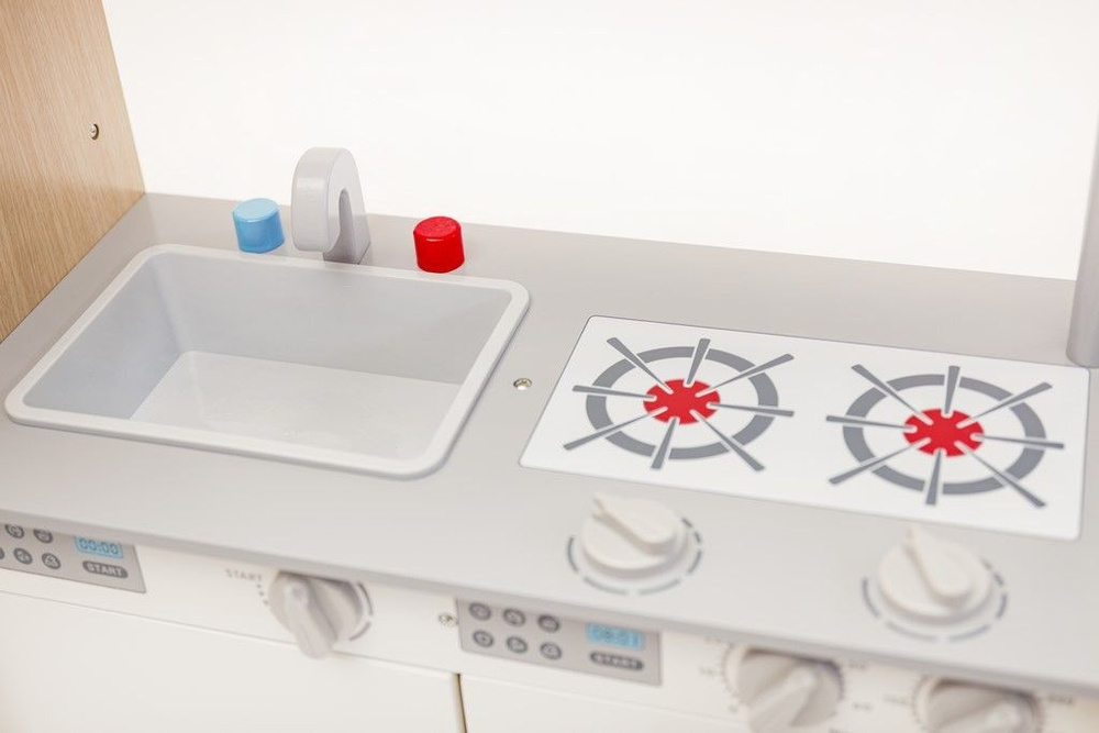 Dodatkową atrakcją są ruchome pokrętła płyty grzewczej, piekarnika oraz pralki. Na drzwiczkach lodówki znajduje się tablica, na której (przy pomocy kredy) mały kucharz z łatwością stworzy swoją listę zakupów.