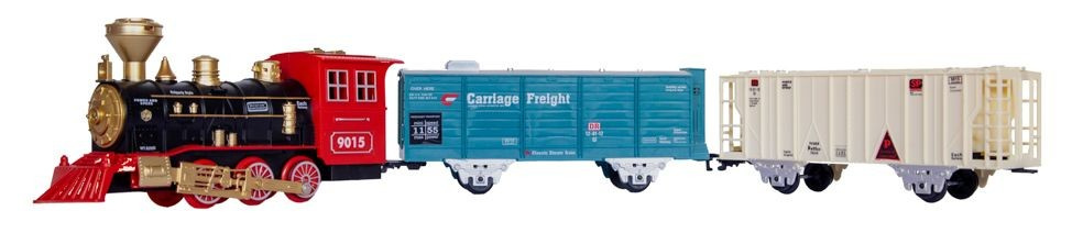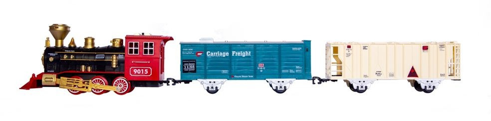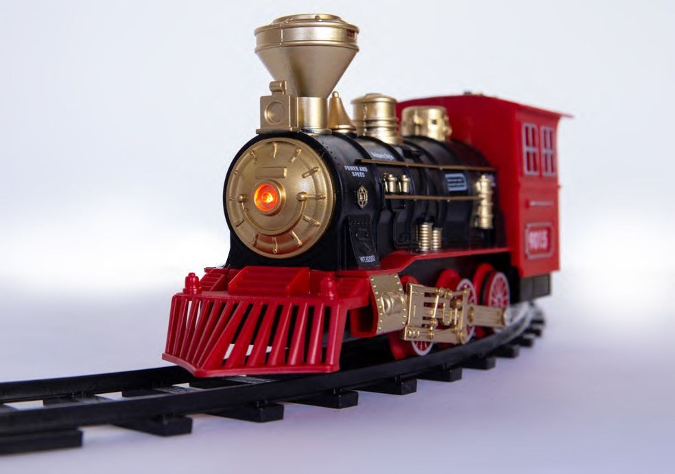 Kto z nas nie marzył kiedyś o własnej kolejce? Zabawa nią to dla dziecka znakomita okazja do pobudzenia wyobraźni i zdolności manualnych. Dla rodziców to możliwość aktywnego spędzania czasu z dzieckiem. Zestaw składa się z 8 odcinków torów, lokomotywy i dwóch wagonów. Poszczególne elementy toru bardzo łatwo się ze sobą łączą tworząc trasę w kształcie okręgu. Lokomotywa wyposażona jest w światło LED, po uruchomieniu imituje odgłosy jadącego pociągu, a dodatkowo wraz z upływem czasu przyspiesza. Najatrakcyjniejszą cechą kolejki jest możliwość wytworzenia pary wodnej. Przy pomocy dołączonej do zestawu buteleczki napełniamy wodą zbiorniczek w lokomotywie i gotowe: „para buch, koła w ruch…”, dokładnie jak w znanym każdemu wierszyku! Realistyczny wygląd i dźwięki kolejki to dodatkowa zachęta do wspaniałej zabawy. Niepowtarzalne emocje towarzyszące wykorzystaniu poszczególnych elementów zestawu to tylko wstęp do prawdziwej rodzinnej zabawy. Produkt zapakowany jest w kartonowe pudełko, które świetnie nadaje się na prezent.