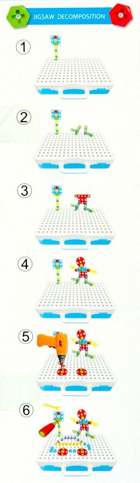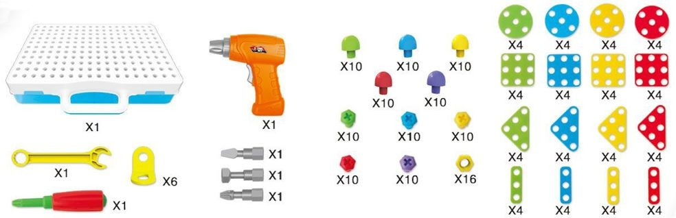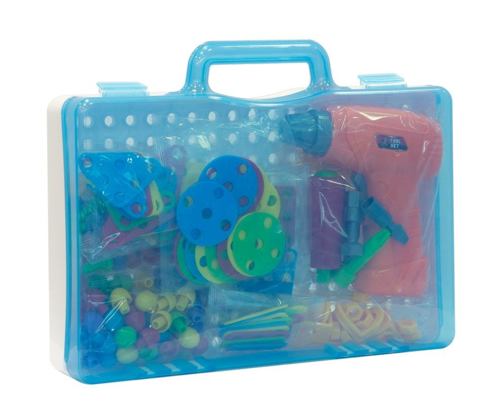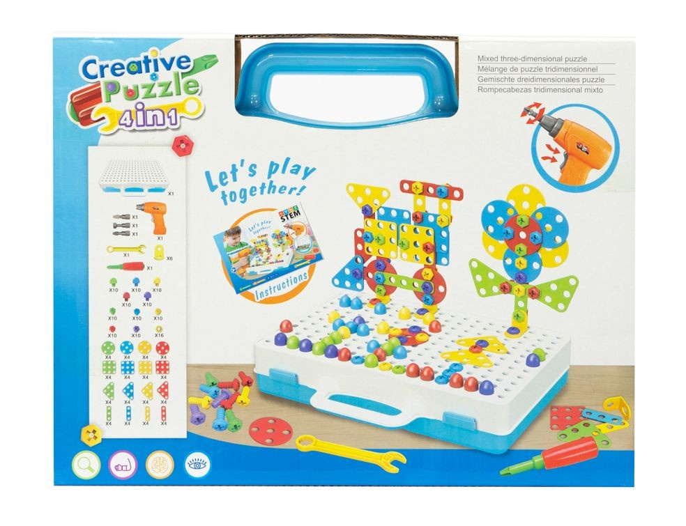 Zestaw puzzli konstrukcyjnych, który składa się z aż 193 różnych elementów. Dziecko ma do dyspozycji 64 części płaskie w różnych kształtach i kolorach, które może swobodnie ze sobą łączyć. Łączniki kątowe umożliwiają tworzenie konstrukcji trójwymiarowych! Wszystko spakowane jest w poręczną walizkę z przegródkami, która pozwala utrzymać porządek, a pokrywa posiada otwory do których montujemy elementy konstrukcyjne. Mieszczą się one w jej wnętrzu, a walizeczka posiada poręczny uchwyt, więc dziecko może zabrać ze sobą swój zestaw niemal wszędzie. Różnorodność elementów rozwija kreatywność i wyobraźnię przestrzenną dziecka. Do zestawu dołączony jest klucz francuski, śrubokręt a także wkrętarka na baterie z 3 końcówkami! Elementy mogą zostać przykręcone zarówno przy pomocy dołączonych narzędzi, jak i własnoręcznie, co rozwija zdolności manualne dziecka. Dzięki wszystkim powyższym cechom zestaw zapewni obdarowanemu wiele godzin kreatywnej zabawy! Produkt zapakowany jest w kartonowe pudełko, które świetnie nadaje się na prezent.