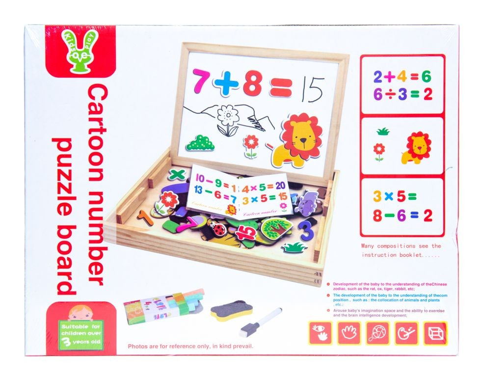 - biała, magnetyczna - służy do pisania pisakiem suchościeralnym oraz przyczepiania najróżniejszych magnesów dołączonych do zestawu (m.in. zwierzątka, literki. cyferki)