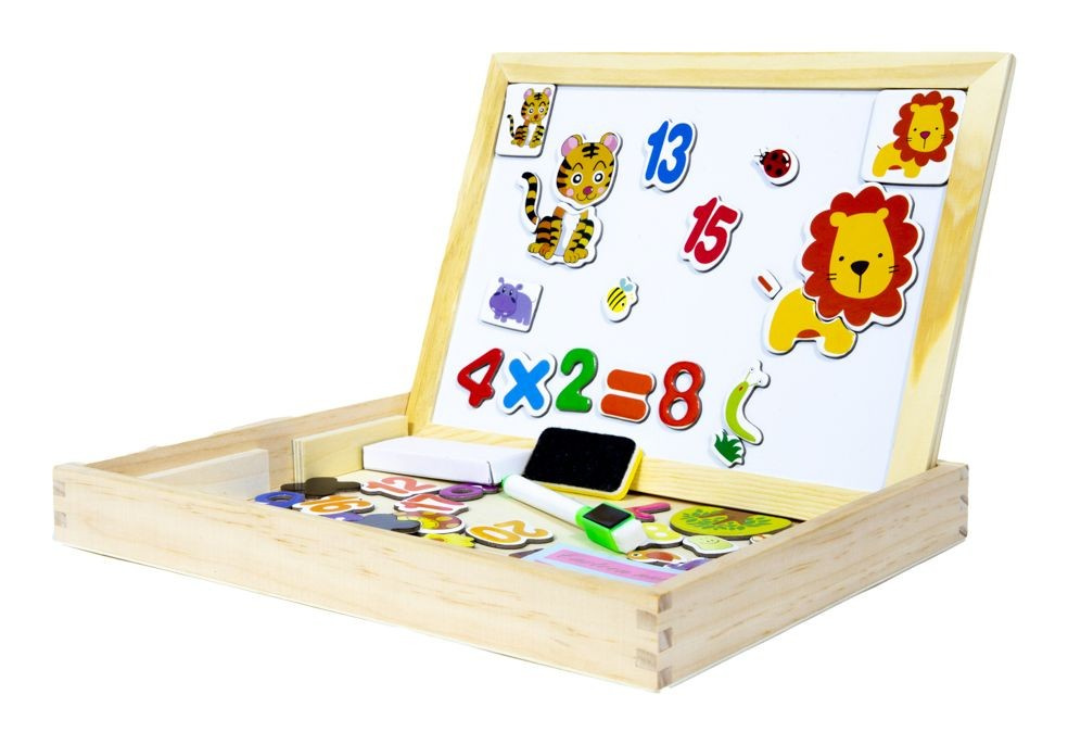- dwustronna tablica wraz z drewnianą skrzyneczką do przechowywania m.in. magnesów