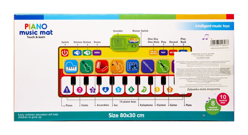 Inteligentna mata muzyczna, imitująca pianinko zachęci do kreatywnej zabawy niejedno dziecko. Wszystkie klawisze i ikony na macie aktywujemy pod wpływem nacisku. Ta doskonała, muzyczna oraz ruchowa zabawa pozwoli bawić się do skomponowanych przez siebie melodii. Można nagrać melodię przy pomocy przycisku z napisem "RECORD" i odtwarzać wielokrotnie, używając do tego celu przycisku "PLAY BACK", dodatkowo zabawka posiada stopniowaną regulację głośności.