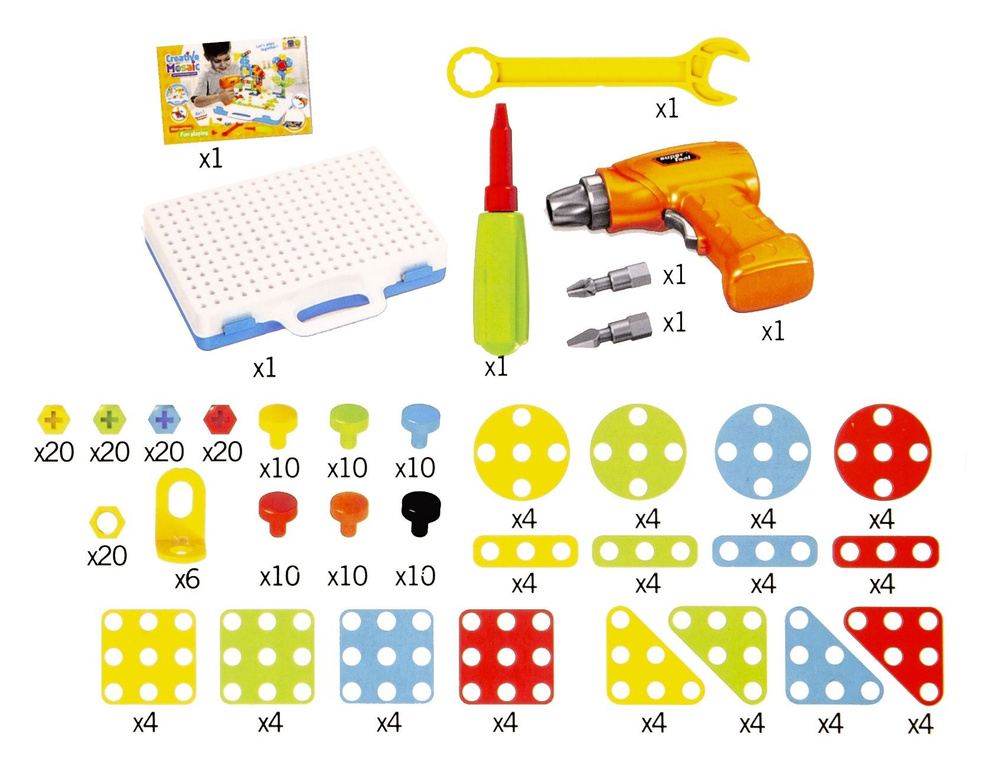 Ten produkt to marzenie każdego małego majsterkowicza! W zestawie znajduje się wiele kolorowych elementów o różnych kształtach, które pomogą w rozwijaniu wyobraźni oraz kreatywności dziecka. W zestawie znajduje się 237 elementów w tym dołączony został klucz francuski, śrubokręt a także wkrętarka na baterie. Elementy mogą zostać przykręcone zarówno przy pomocy dołączonych narzędzi, jak i własnoręcznie, co rozwija zdolności manualne dziecka.