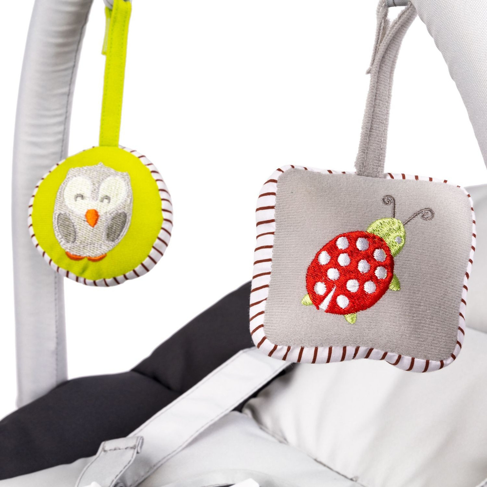 Leżaczek został wyposażony w zdejmowany pałąk z przyczepionymi zabawkami, zapewnią one dziecku rozrywkę, stymulując wzrok i rozwijając zmysł dotyku. Zabawki przyczepione są do pałąka za pomocą rzepu, dzięki czemu można je z łatwością zdjąć, zmienić ich kolejność lub w ich miejsce zawiesić inne ulubione zabawki dziecka.