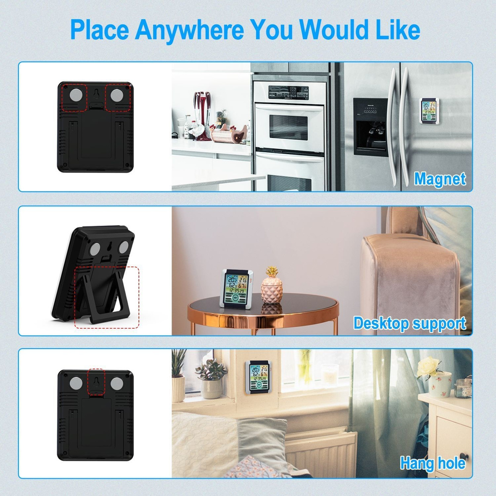 Magnetyczne zaczepy umieszczone z tyłu urządzenia pozwolą szybko i efektownie umieścić stację pogody np. na lodówce. Stacja pogody może zostać ustawiona również bezpośrednio na stoliku czy półce lub podwieszona na ścianie za pomocą kołków montażowych.