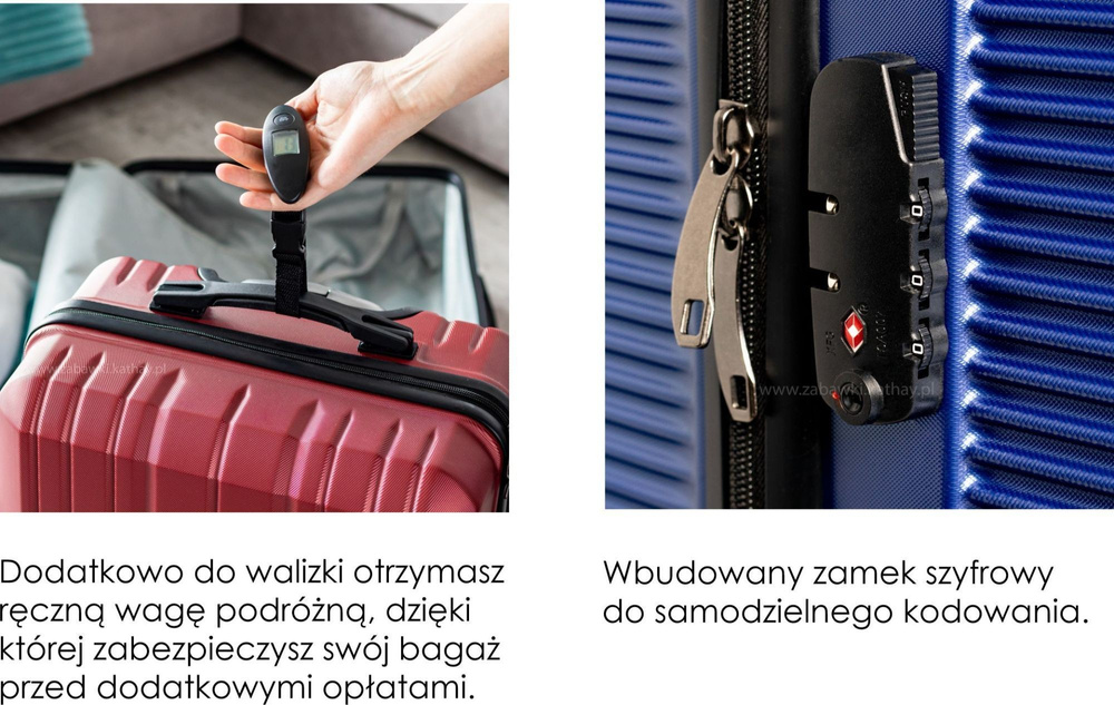 Zestaw 3 walizek podróżnych z wbudowanym zamkiem szyfrowym, wykonanych z najwyższej jakości materiałów(ABS+PC). Walizki są bardziej wytrzymałe i odporne na wszelkie uszkodzenia podczas podróży, wewnątrz zamontowany został trwały, aluminiowy stelaż, dzięki czemu są one lekkie. Cztery, obrotowe kółka zapewniają stabilność, ułatwiając prowadzenie bagażu w dowolnym kierunku. Wnętrze wyścielone miękką, materiałową podszewką z pasami utrzymującymi zawartość na swoim miejscu, tworzy dwie funkcjonalne komory.