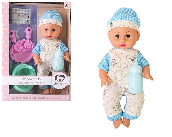Uroczy bobas z akcesoriami. W skład zestawu wchodzi lalka o wysokości około 31 cm, ubrana w mięciutkie ubranko w pastelowych kolorach oraz akcesoria:
