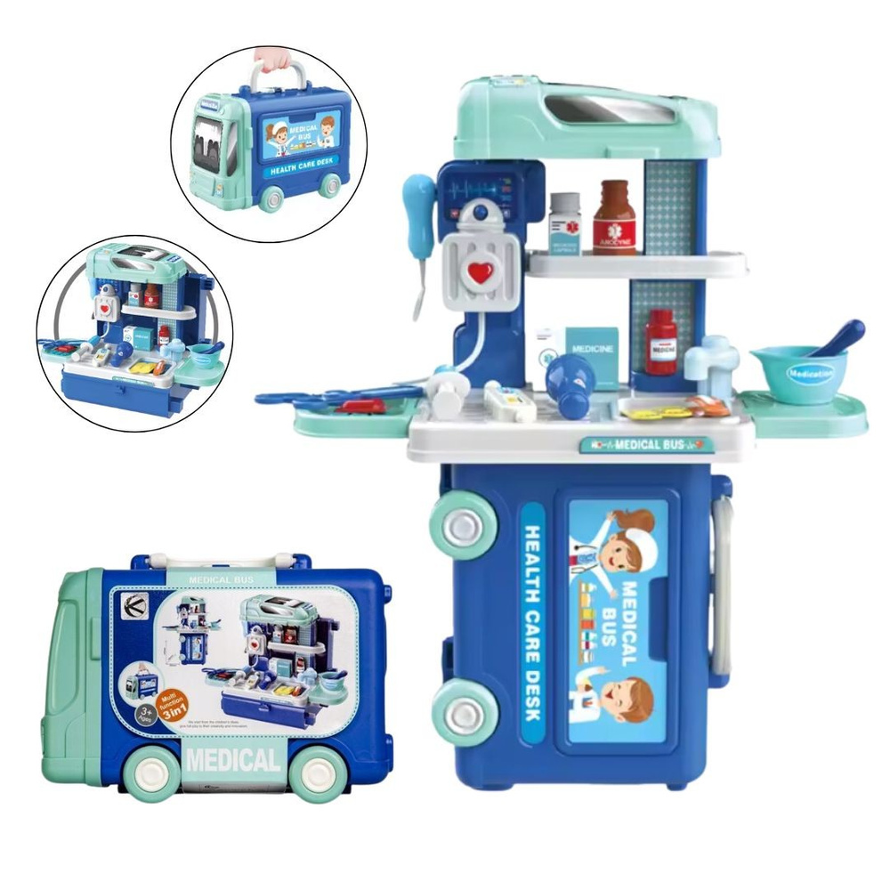 W skład zestawu wchodzą plastikowe przyrządy, które przydadzą się każdemu małemu lekarzowi. Łącznie 29 elementów spakowanych w kuferek z kółkami, który po rozłożeniu pełni funkcję wygodnego stanowiska medycznego. Wykonany z wysokiej jakości plastiku, zapewnia długie godziny pełne zabawy.