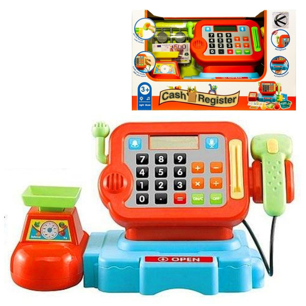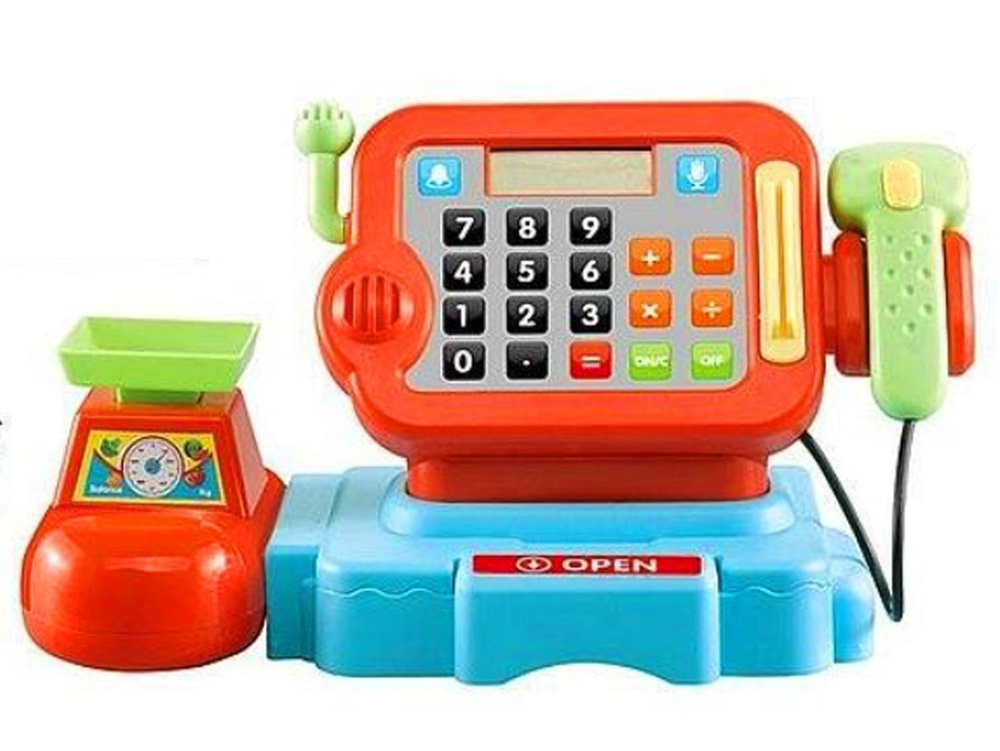 Kasa sklepowa z czytnikiem, mikrofonem, kalkulatorem i wagą