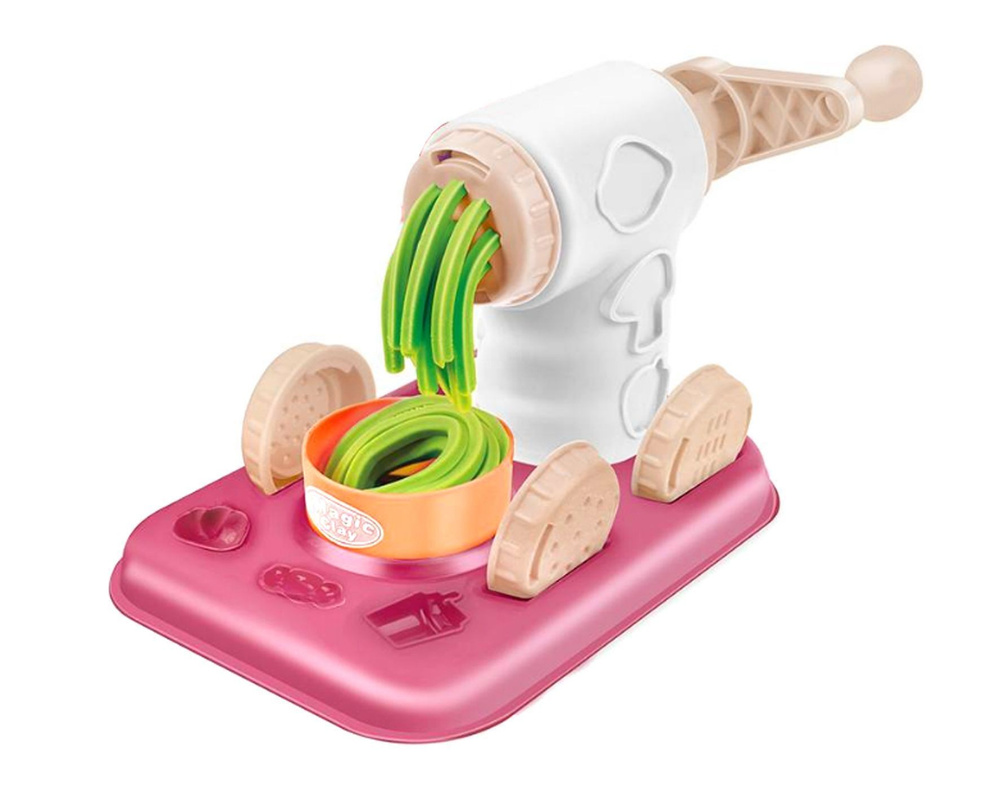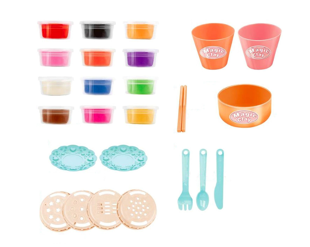 Wysokiej jakości zestaw, który zawiera aż 12 pojemników z różnymi kolorami do wykonywania rozmaitych lodowych deserów, ciast i fast foodów! Dołączone do zestawu foremki pozwolą na stworzenie najróżniejszych potraw do swojej lodziarni. Ten produkt umożliwi dziecku rozwinięcie swoich zdolności manualnych oraz wyobraźni. W zestawie znajdują się 4 formy do wyciskania ciastoliny, cztery kubeczki, dwa talerzyki, dwa widelce, dwa noże oraz dwie łyżeczki.