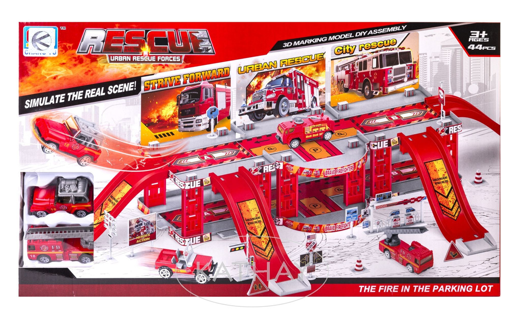 Zabawka będzie idealnym prezentem dla każdego dziecka, które jest miłośnikiem straży pożarnej. W zestawie znajdują się dwa metalowe autka o długości 7 cm. Parking samochodowy jest wyposażony w 4 podjazdy, znaki ostrzegawcze, stację benzynową. Zestaw ten zapewni dziecku wiele godzin wspaniałej zabawy.