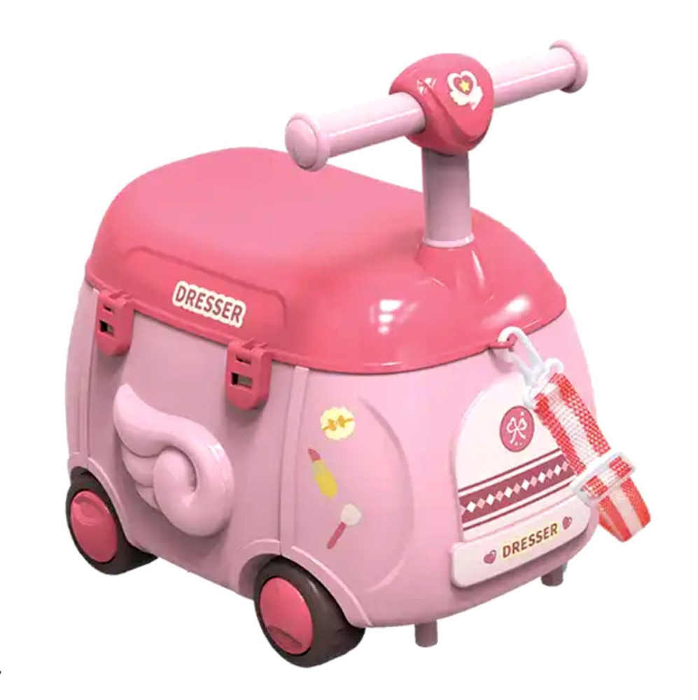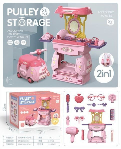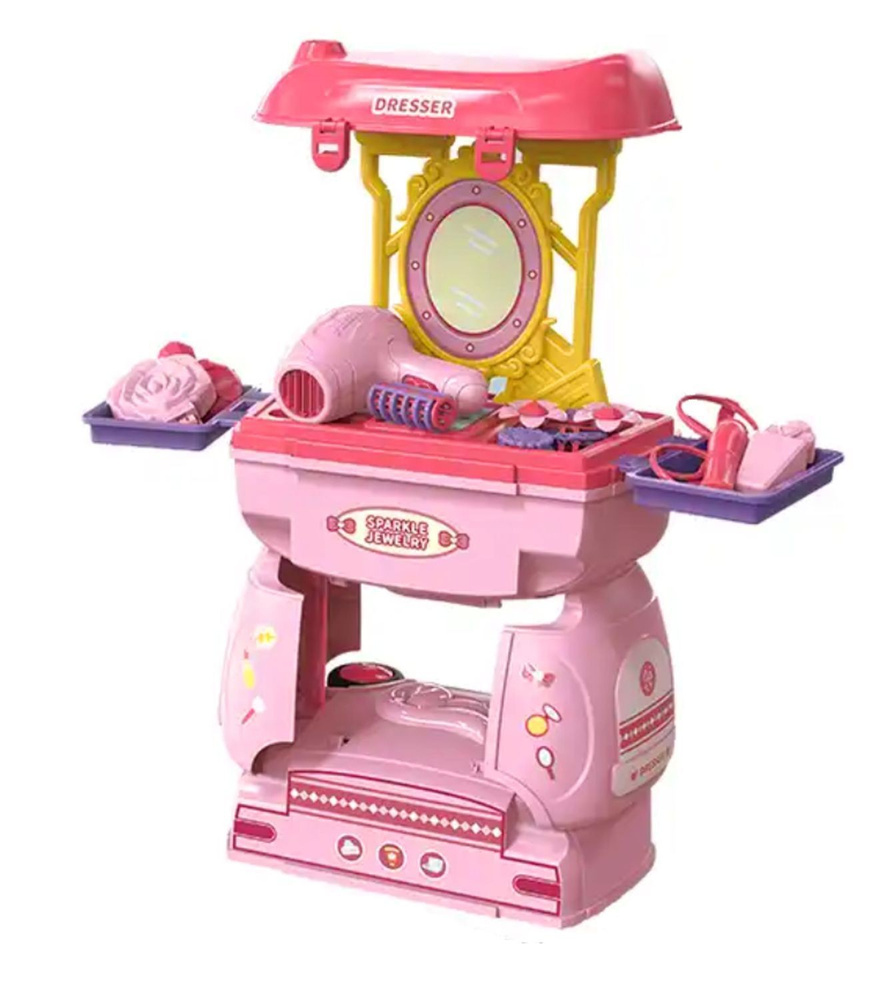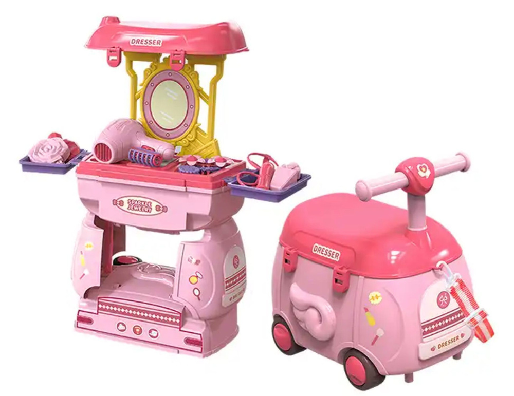 Śliczna toaletka, służąca również jako jeździk, to mobilny kącik piękności, który można zabrać ze sobą w podróż. Można złożyć ją w walizkę z kierownicą, dzięki czemu wszystkie elementy będą wygodnie przechowywane. Na blacie wyodrębnione zostały miejsca do ułożenia skarbów jej właścicielki tak, aby nic nie zginęło. W zestawie znajduje się biżuteria (4 spinki do włosów), atrapy kosmetyków (2 buteleczki i 1 pomadka) wałek do włosów, okulary oraz dwie szczotki. Ale to jeszcze nie wszystko! Do zestawu dołączona jest także suszarka do włosów! W trosce o najmłodszych, zabawka została wykonana z wysokiej jakości tworzywa. Żywa kolorystyka i estetyczne wykonanie skutecznie zachęcają do zabawy. Dzięki atrakcyjnemu opakowaniu idealnie nadaje się na prezent.