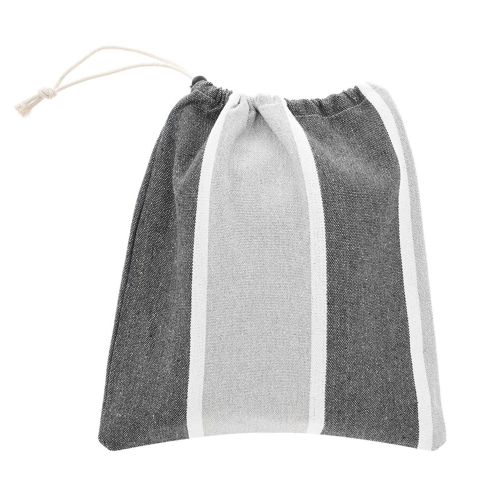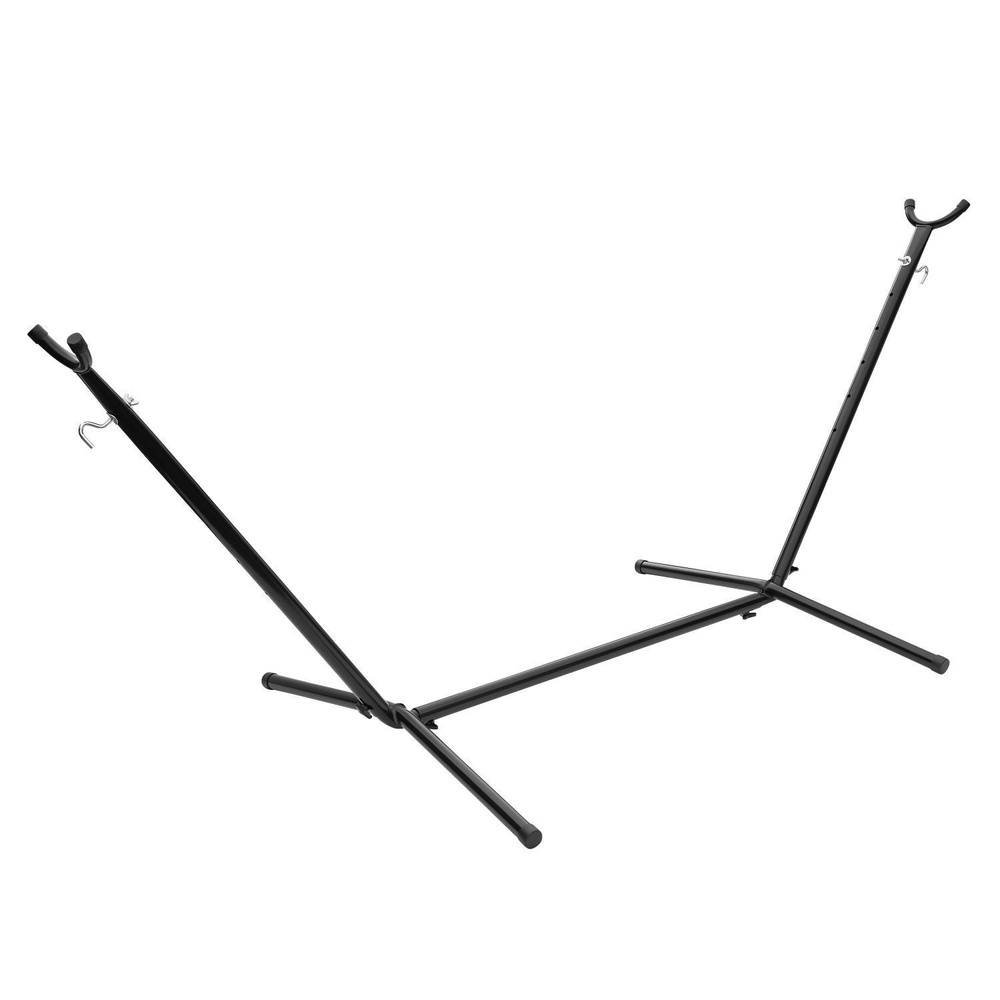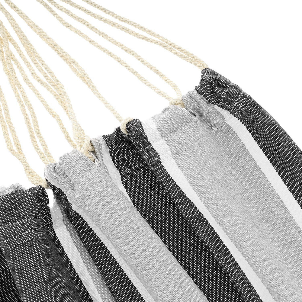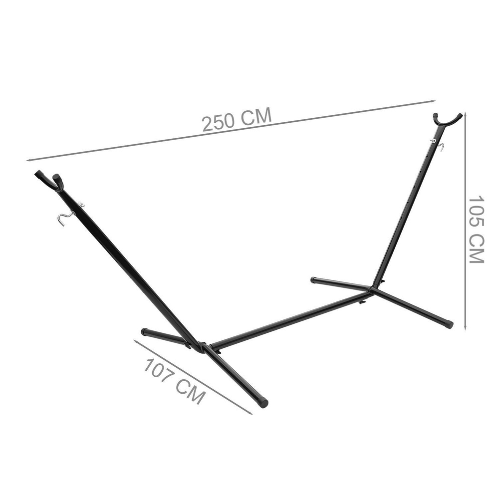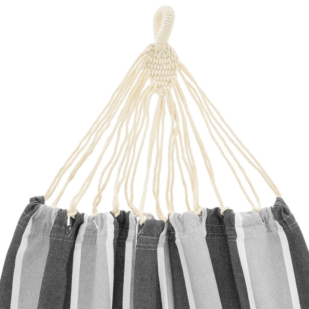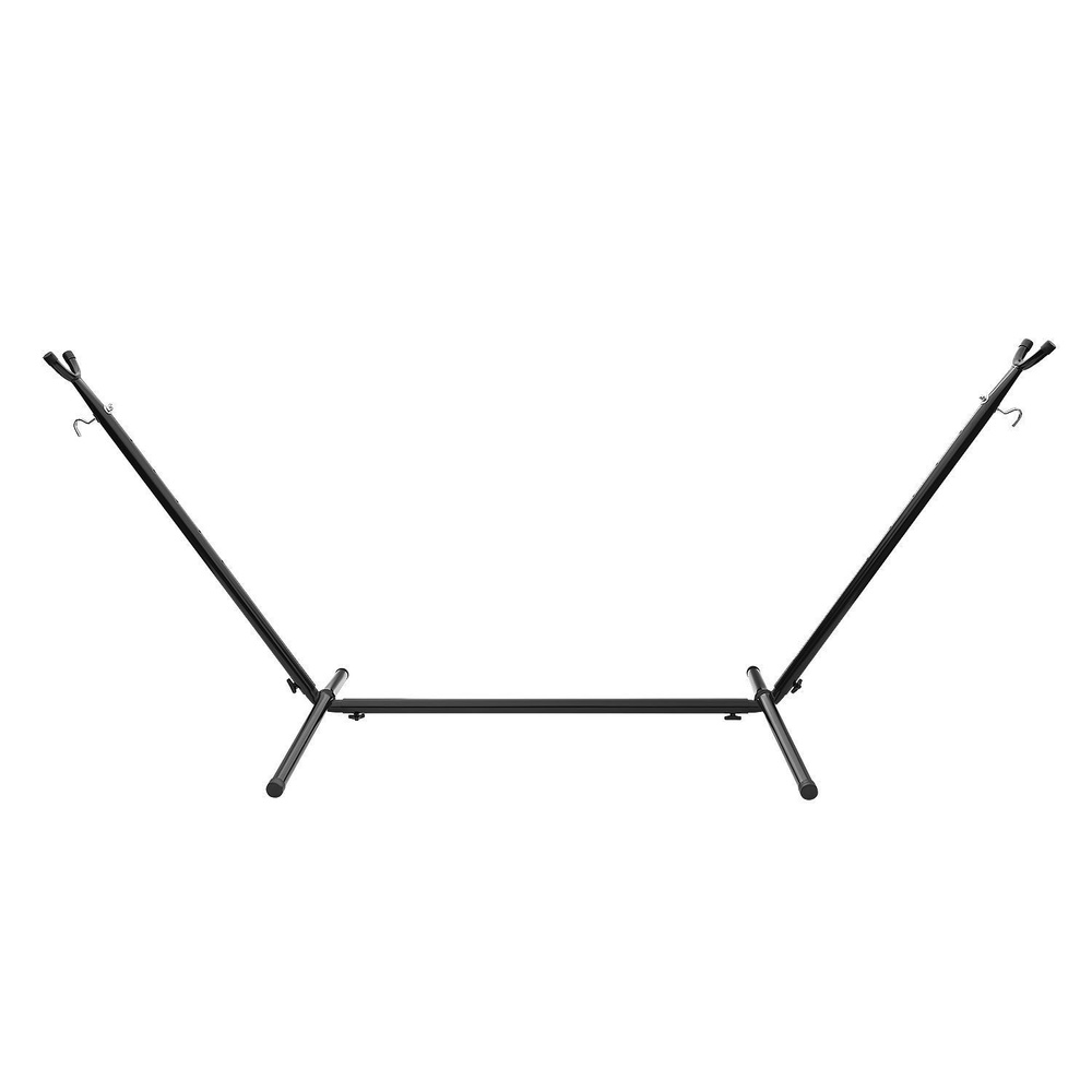 Hamak wykonany został z przewiewnego, mocnego materiału, zapewniającego wytrzymałość i odporność na przetarcia, natomiast stelaż wykonany został ze stali, pomalowanej proszkowo na kolor czarny.