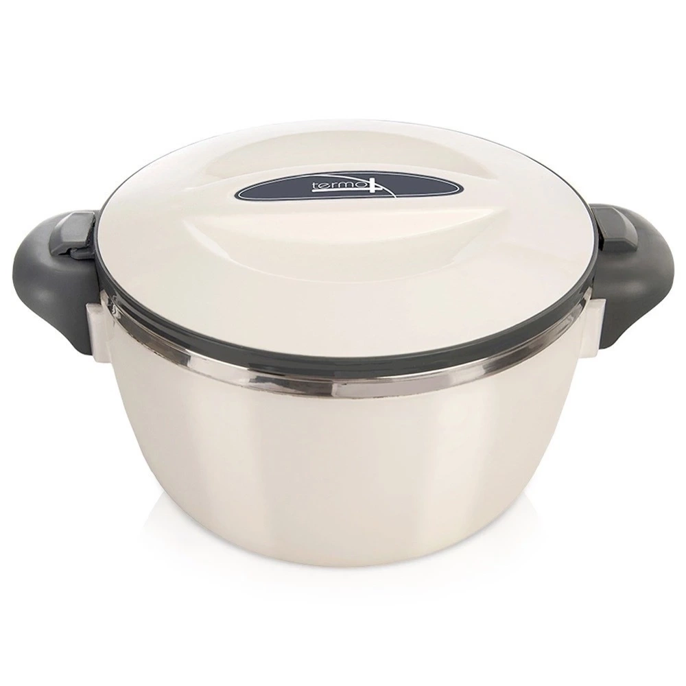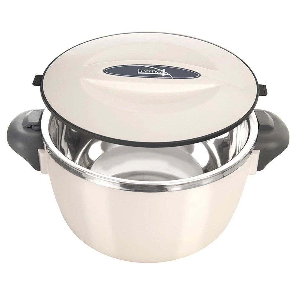 - Wykonana ze stali nierdzewnej - Termomisa wewnątrz wykonana jest ze stali nierdzewnej. Zewnętrzna obudowa wykonana jest z tworzywa w kremowym, perłowym kolorze. Pokrywka w kolorze białym, a uchwyty w szarym kolorze.