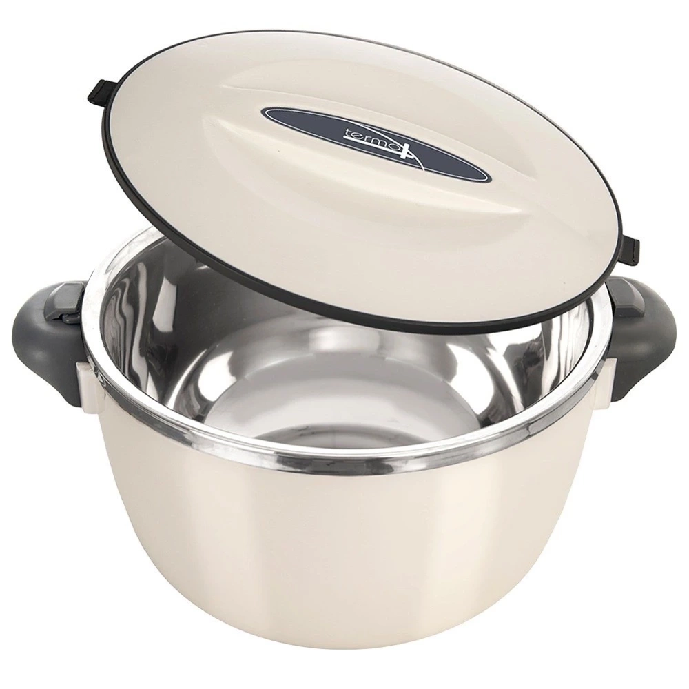 - Wykonana ze stali nierdzewnej - Termomisa wewnątrz wykonana jest ze stali nierdzewnej. Zewnętrzna obudowa wykonana jest z tworzywa w kremowym, perłowym kolorze. Pokrywka w kolorze białym, a uchwyty w ciemno szarym kolorze.