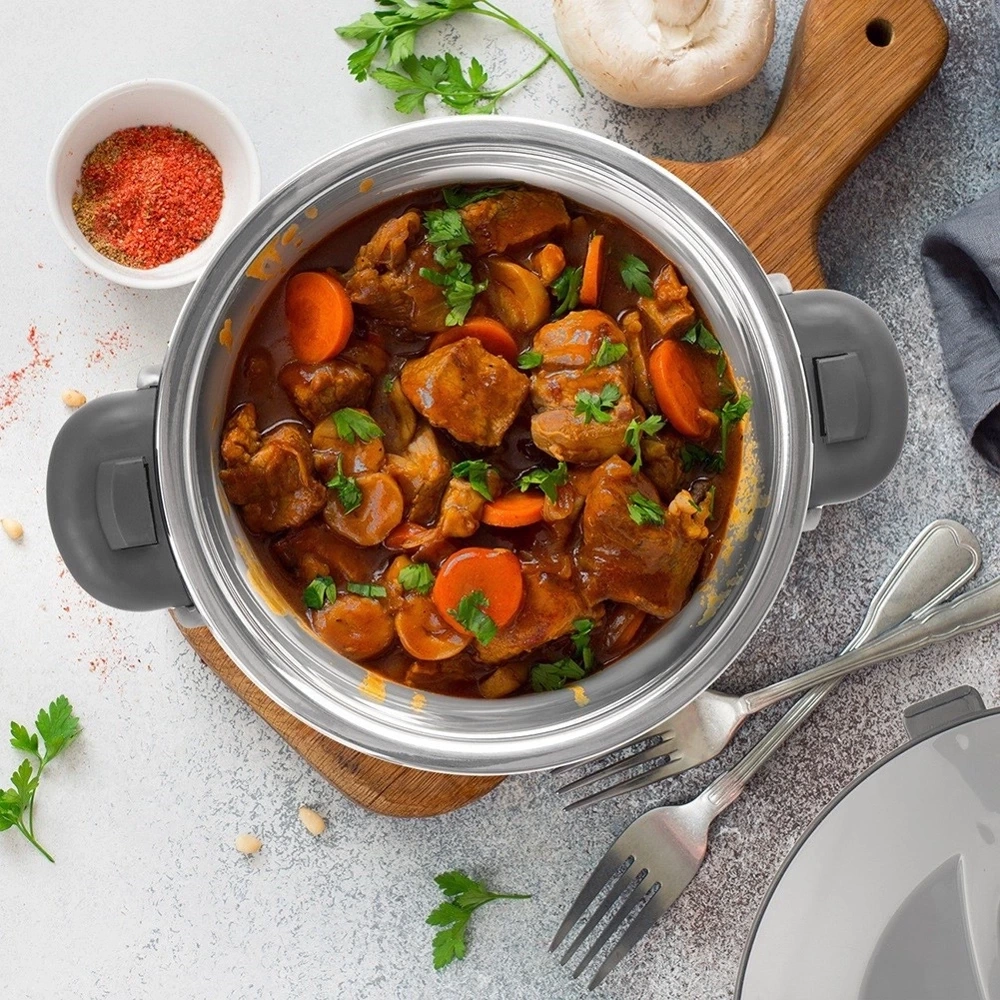 - Wykonana ze stali nierdzewnej - Termomisa wewnątrz wykonana jest ze stali nierdzewnej. Zewnętrzna obudowa wykonana jest z tworzywa w szarym, perłowym kolorze. Pokrywka w kolorze szarym, a uchwyty w ciemno szarym kolorze.