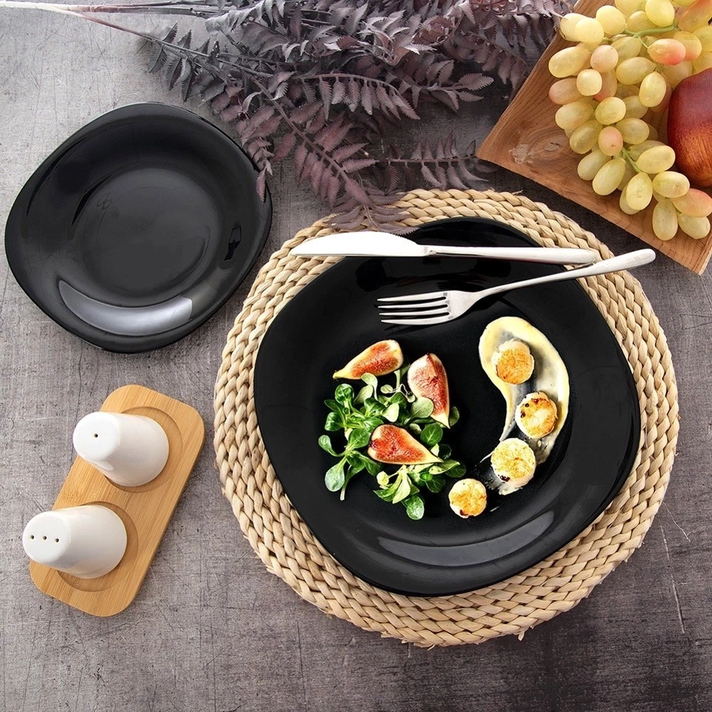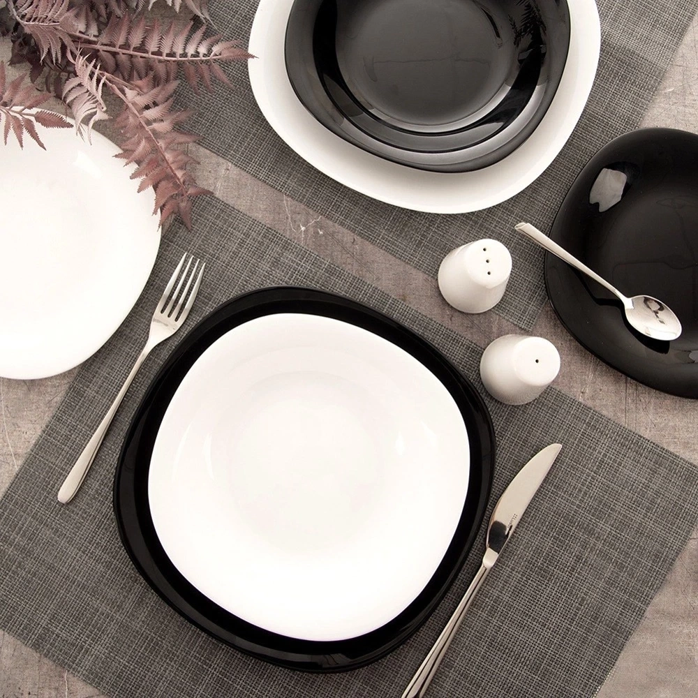 - Płytki talerz obiadowy w kwadratowym kształcie 26,5 x 26,5 cm. Wykonany ze szkła opalowego w czarnym kolorze. Sprawdzi się do serwowania wielu rodzajów posiłków.