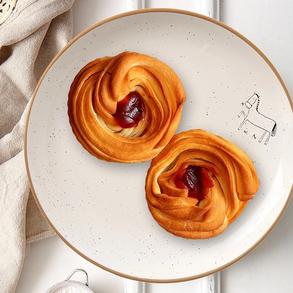 - Talerz deserowy wykonany z ceramiki w beżowym kolorze z efektownym, kamionkowym brzegiem. Sprawdzi się do serwowania ciast, deserów i przekąsek.