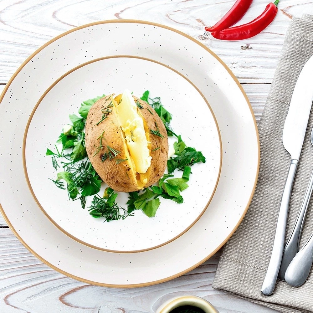 - Wykonany z ceramiki - Wykonany z najwyższej jakości ceramiki w beżowym kolorze z nakrapianym wzorem. Posiada naturalny, kamionkowy brzeg, który nadaje mu wyjątkowy charakter i sprawia, że prezentuje się efektownie na każdym stole.