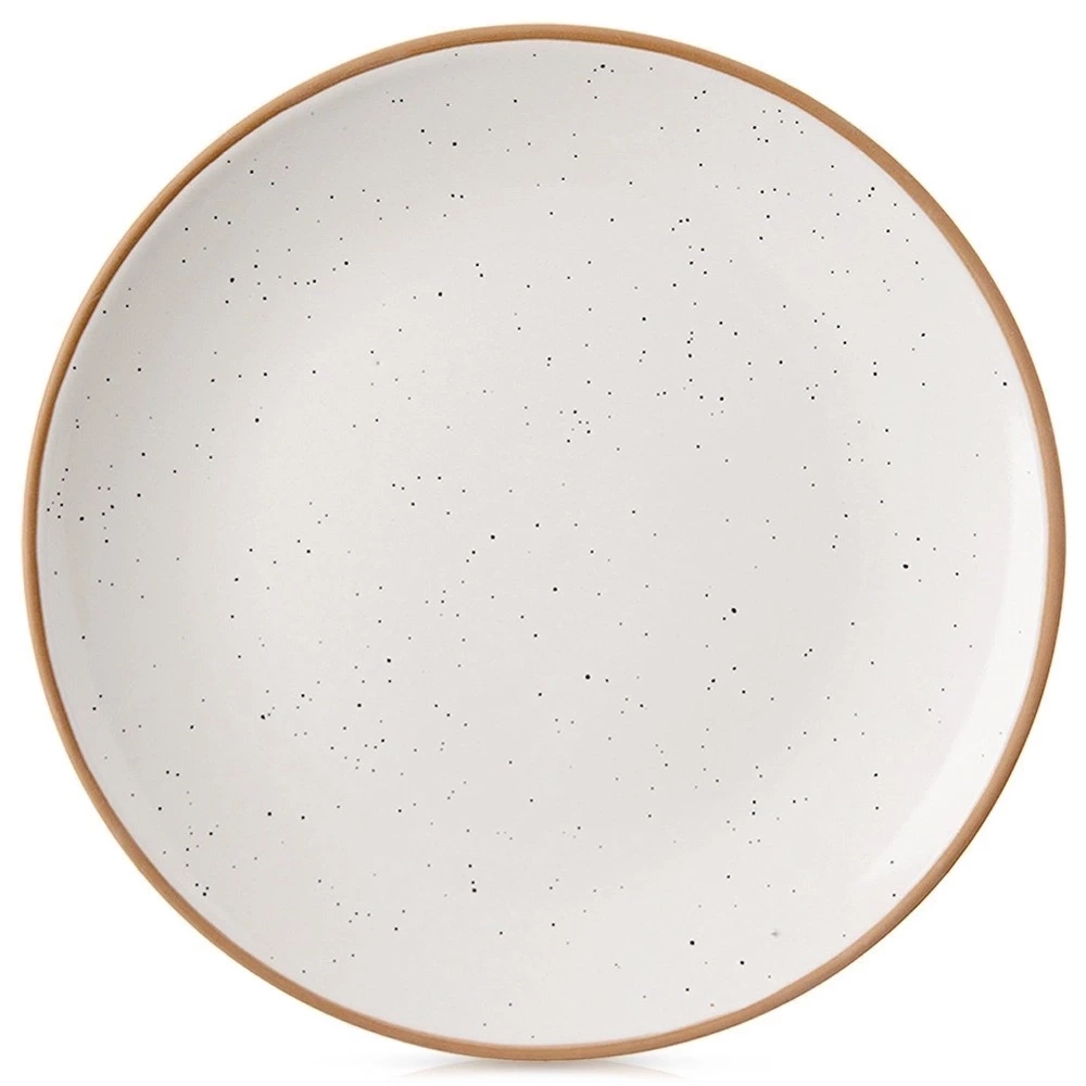 - Płytki talerz obiadowy o średnicy 27 cm. Wykonany z ceramiki w beżowym kolorze z efektownym, kamionkowym brzegiem. Sprawdzi się do serwowania wielu rodzajów posiłków.