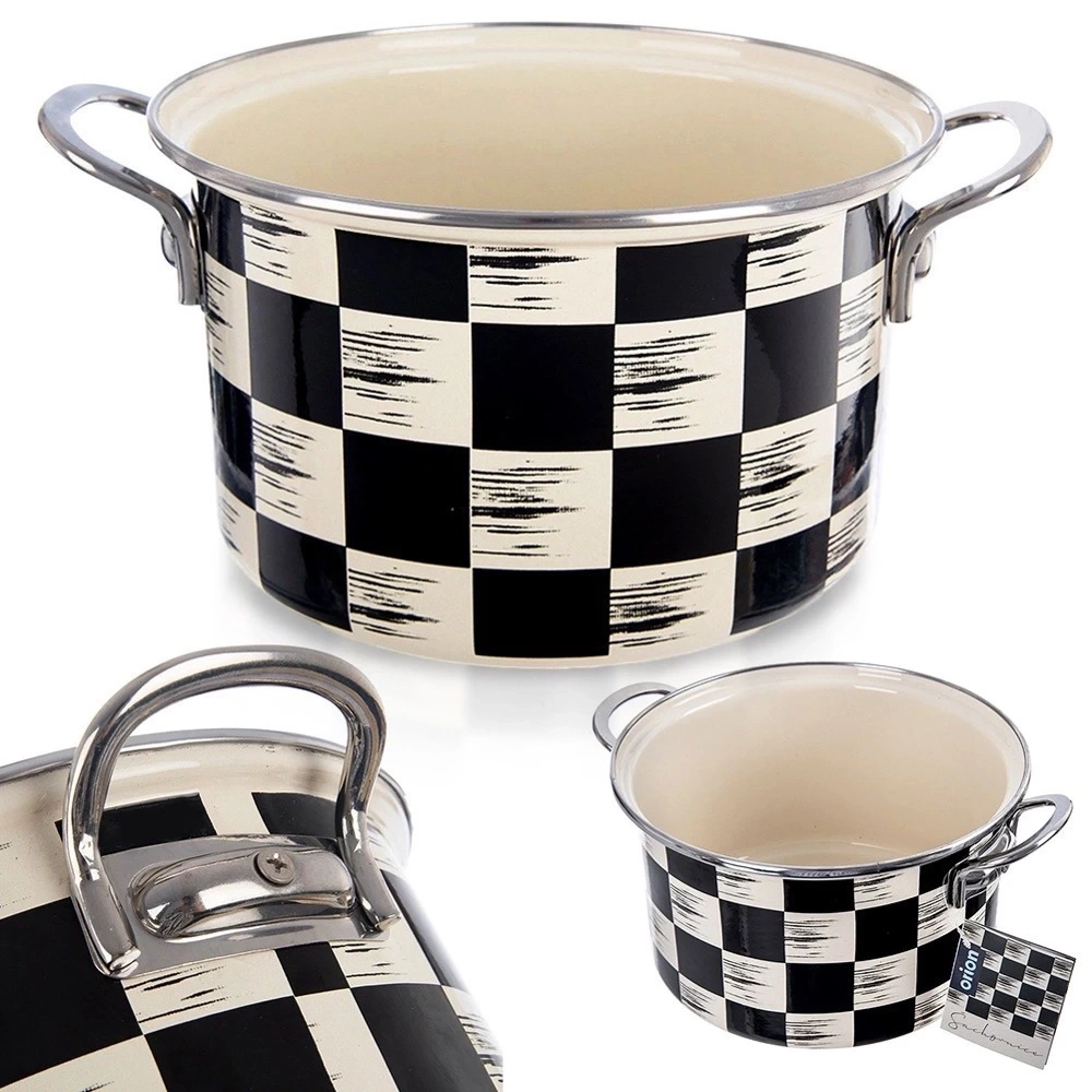 - Praktyczny garnek o pojemności 4 l - Garnek emaliowany z uchwytami przydatny w każdym domu. Garnek ma pojemność 4 l, wysokość 13 cm i średnicę 22 cm. Długość garnka z uchwytami wynosi 28,5 cm. Idealny do gotowania oraz duszenia różnych dań. Garnek z serii Szachownica.