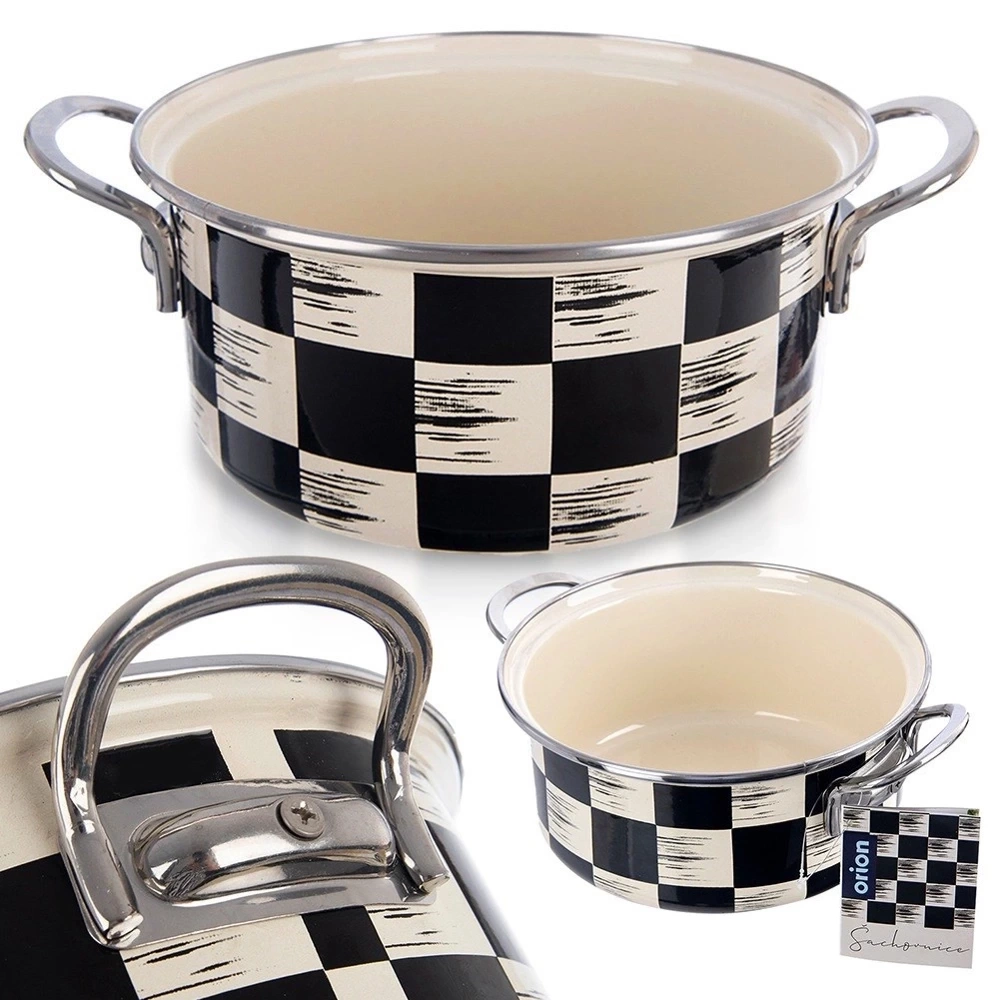 - Praktyczny garnek o pojemności 2,2 l - Garnek emaliowany z uchwytami przydatny w każdym domu. Garnek ma pojemność 2,2 l, wysokość 9 cm i średnicę 20 cm. Długość garnka z uchwytami wynosi 26 cm. Idealny do gotowania oraz duszenia różnych dań. Garnek z serii Szachownica.