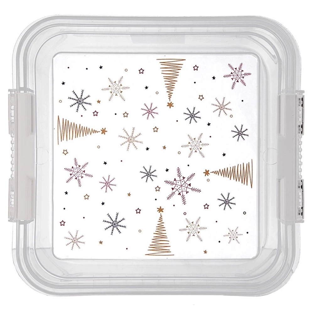 - Szczelne zamknięcie z motywem świątecznym - Pokrywka jest wyposażona w dwa solidne zatrzaski, które umożliwiają pewne zamknięcie. Pokrywka posiada efektowny motyw gwiazdek i choinek.
