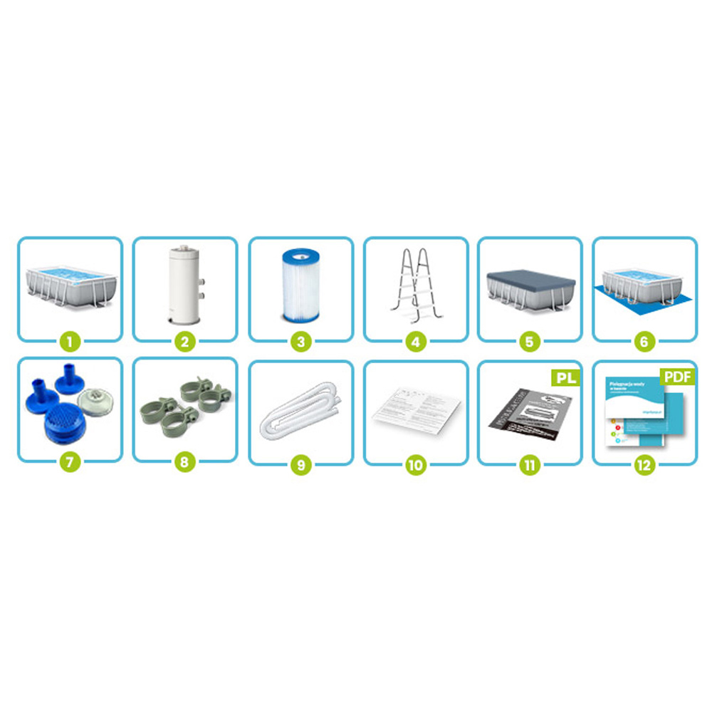 Zestaw zawieraDrabinkaPompa filtrującaPokrywa basenowaMata pod basen
