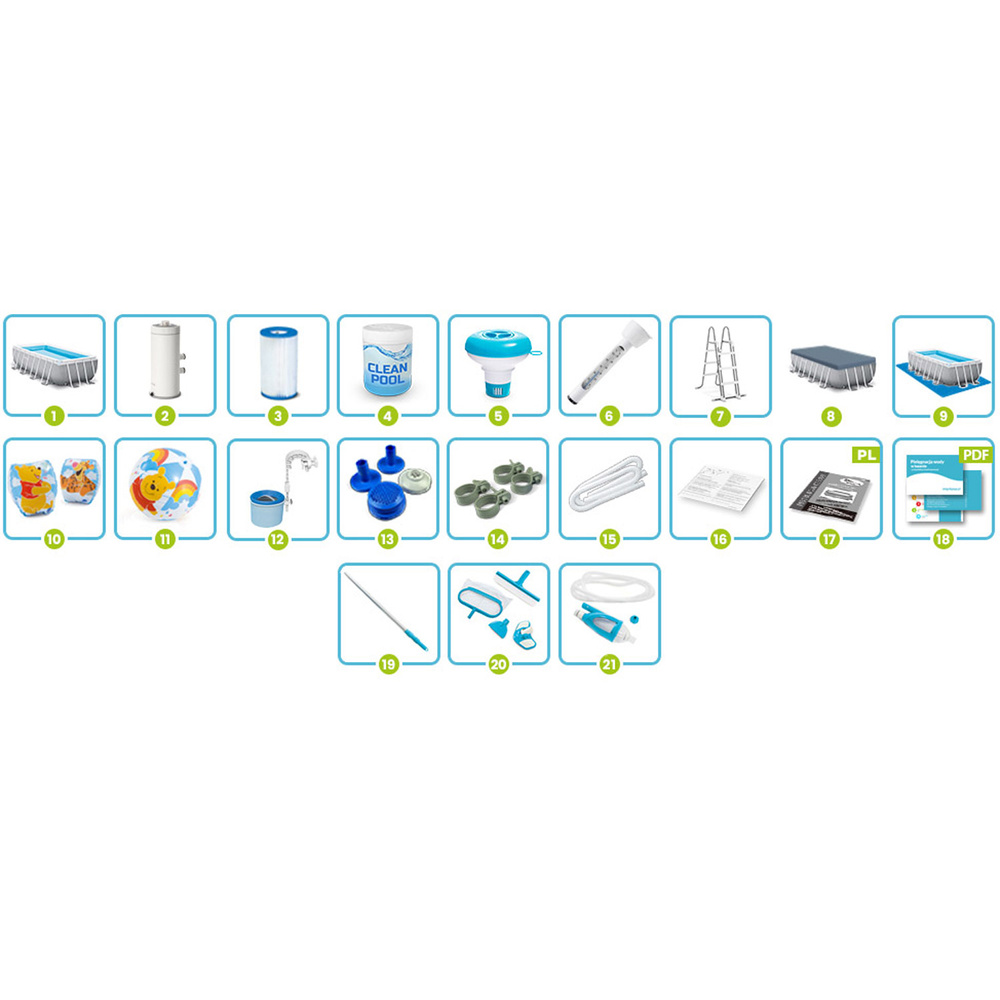 Zestaw zawieraDrabinkaPompa filtrującaPokrywa basenowaMata pod basen