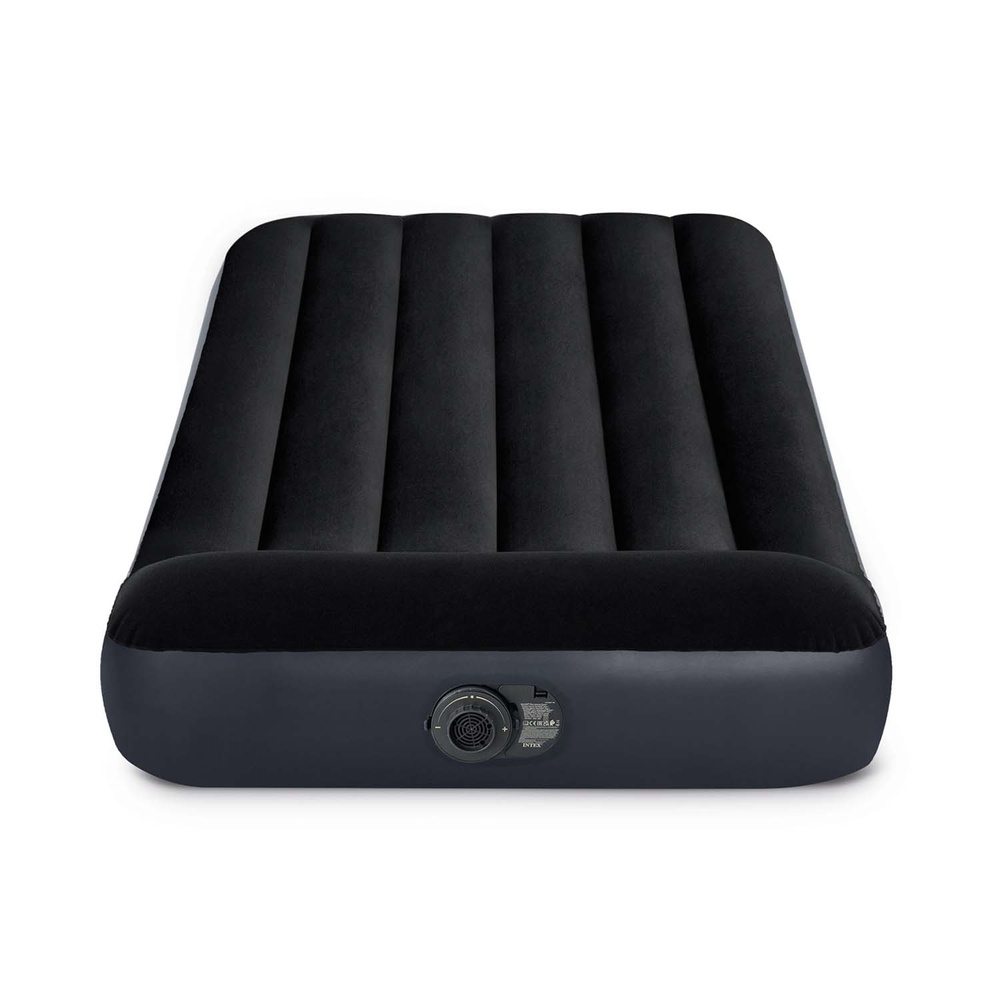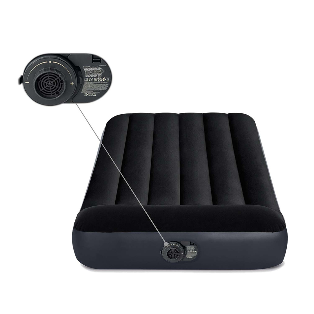 - Klasyczny materac z wbudowaną poduszką i pompką elektryczną firmy INTEX wykonany z mocnego tworzywa PVC.