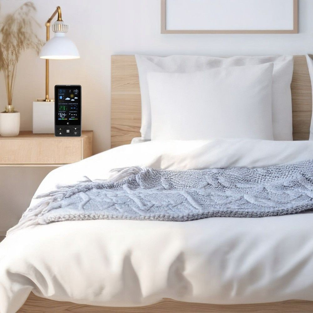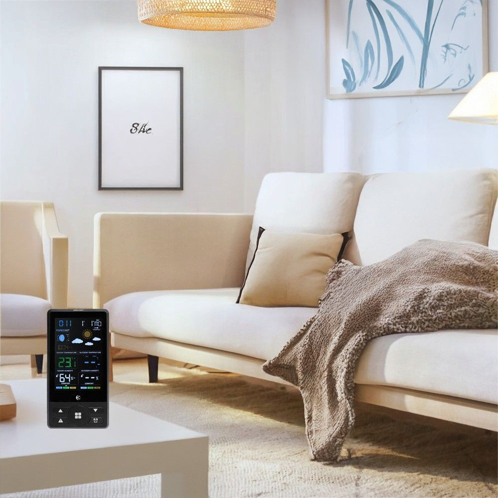 - Bezprzewodowa stacja pogodowa z termometrem, barometrem, zegarem, budzikiem i prognozą pogody pozwala na łatwe monitorowanie warunków atmosferycznych i czasu w jednym urządzeniu.