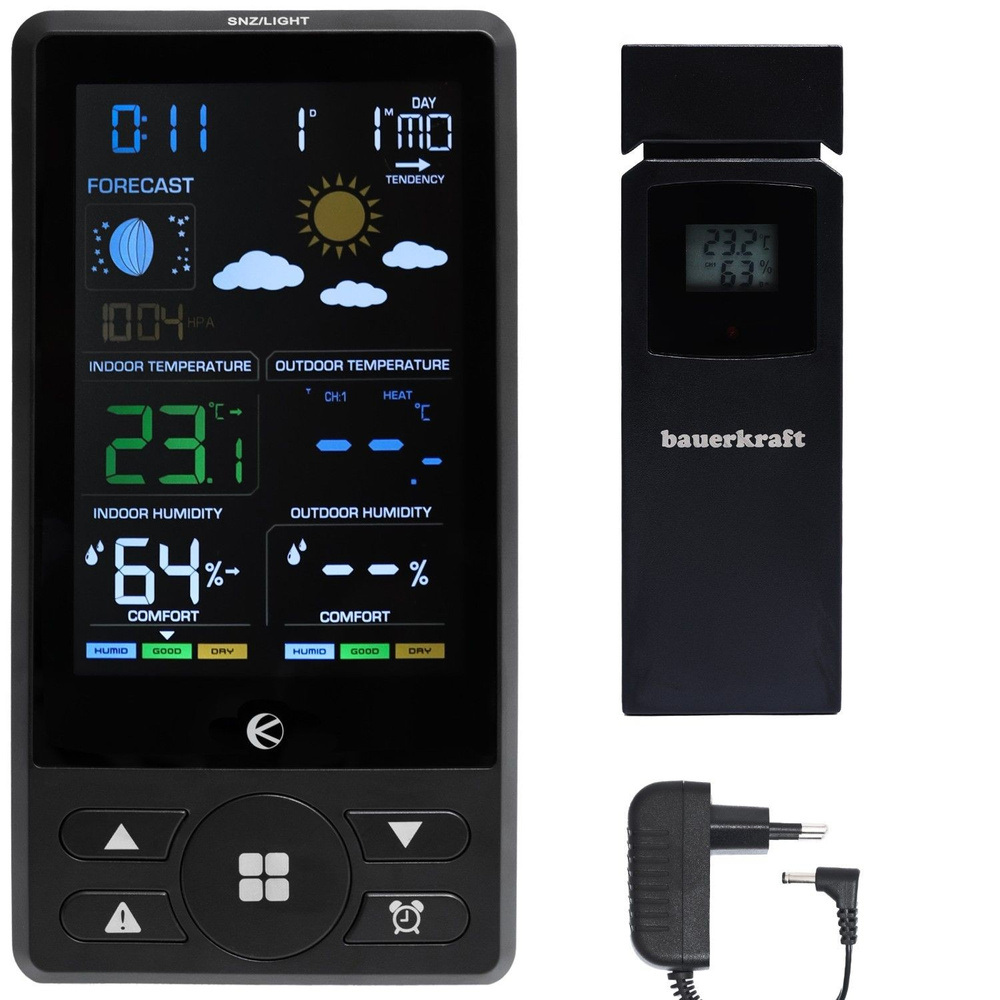 Bezprzewodowa stacja pogodowa to wielofunkcyjne urządzenie przydatne w każdym domu. Stacja wykonuje pomiar takich wartości jak: temperatura czy wilgotność, a dodatkowo posiada funkcję zegar, budzik z funkcją drzemki, fazy księżyca, prognoza pogody na najbliższe 12-24h oraz kalendarz. Urządzenie posiada w zestawie czujnik zewnętrzny z zasięgiem 30 metrów, dzięki któremu możliwy jest pomiar zarówno w pomieszczeniu, jak i na zewnątrz budynku. Podane wartości są aktualizowane na bieżąco.