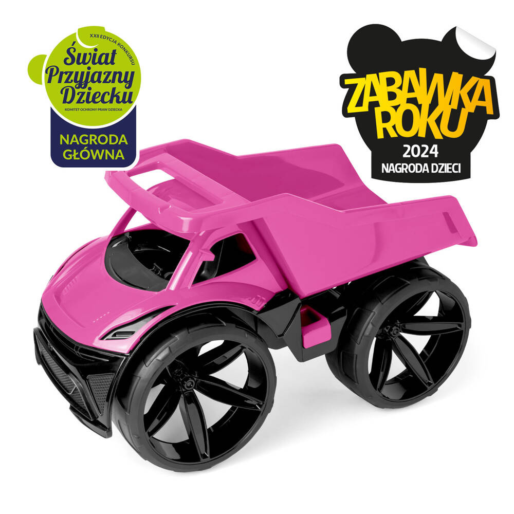MAXIMUS to duża wywrotka w kolorze soczystego różu, która wyróżnia się: nowoczesnym designem, solidną lekką konstrukcją, nowoczesną linią nadwozia z dużymi matowymi kołami oraz pięknym wykończeniem detali. Dodatkowo posiada ruchomy otwierany kiper oraz wygodny uchwyt co pozwala na urozmaiconą i realistyczna zabawę, można wykorzystywać go do przewożenia piasku lub innych zabawek. Pojazd ma 59 cm długości.