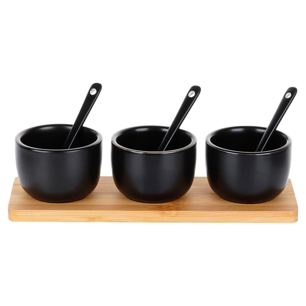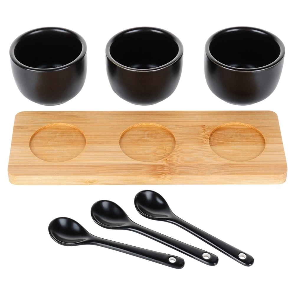 - Zestaw trzech ceramicznych miseczek na bambusowej tacy. W zestawie również 3 ceramiczne łyżeczki. Idealne do serwowania przekąsek, przystawek, sosów, dipów i innych.