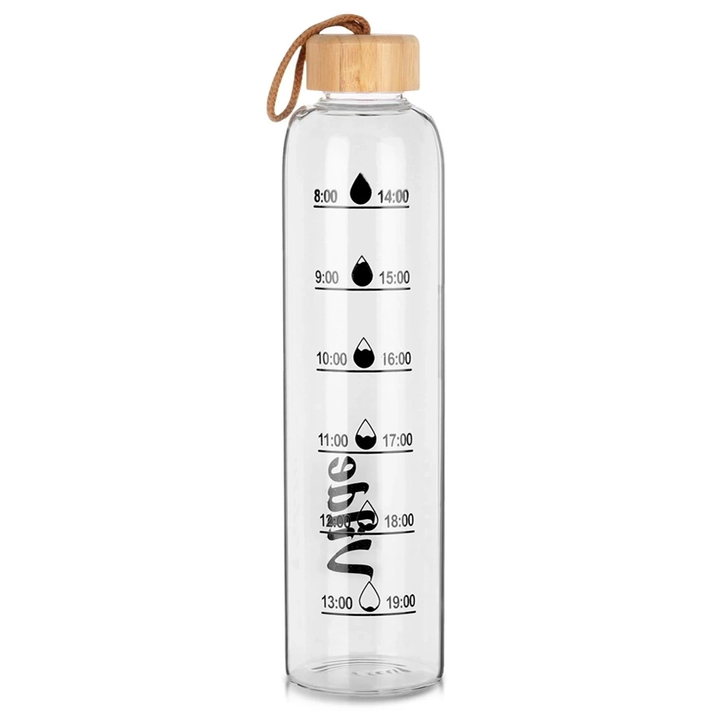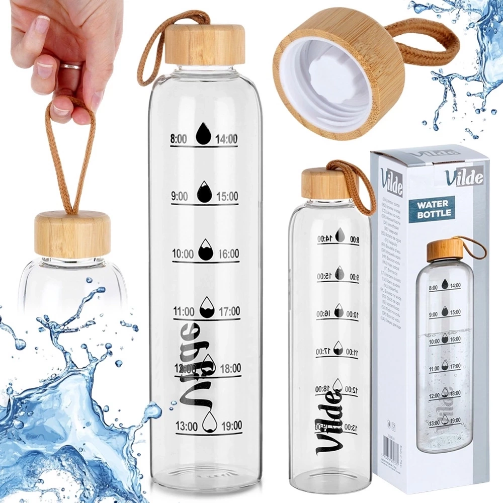- Szklana butelka na wodę o pojemności 1 l. Posiada miarkę czasową ułatwia monitorowanie ilości spożywanej wody. Stylowe oznaczenia motywują do regularnego nawodnienia.