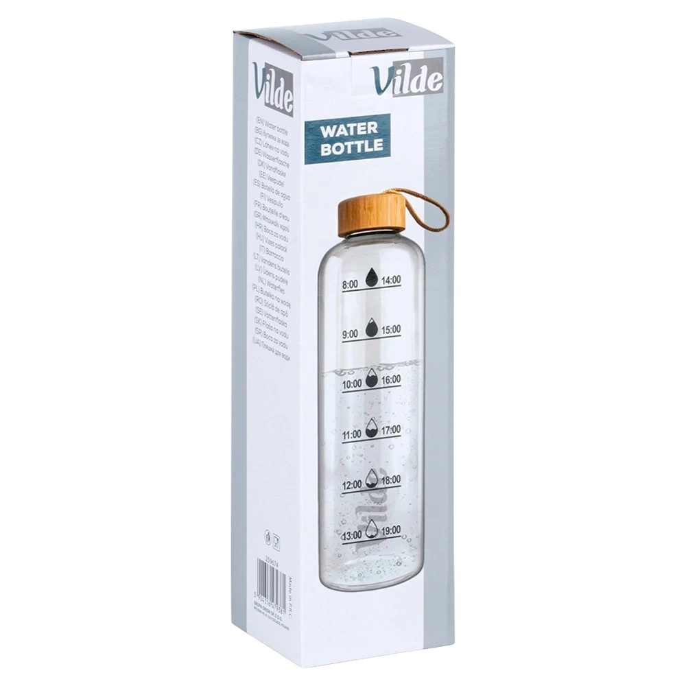 Butelka z bambusową zakrętką. Szczelna dzięki uszczelce. Wykonana z wytrzymałego szkła, więc nadaje się zarówno do napojów ciepłych jak i zimnych. Klasyczny design sprawia, że butelka ma wyjątkowy styl. Odpowiednie nawilżenie w ciągu dnia jest bardzo ważne, dlatego warto butelkę mieć zawsze przy sobie. Butelka jest poręczna i wygodna w użytkowaniu. Oryginalny produkt marki Vilde. Wyprodukowano zgodnie z europejskimi standardami.